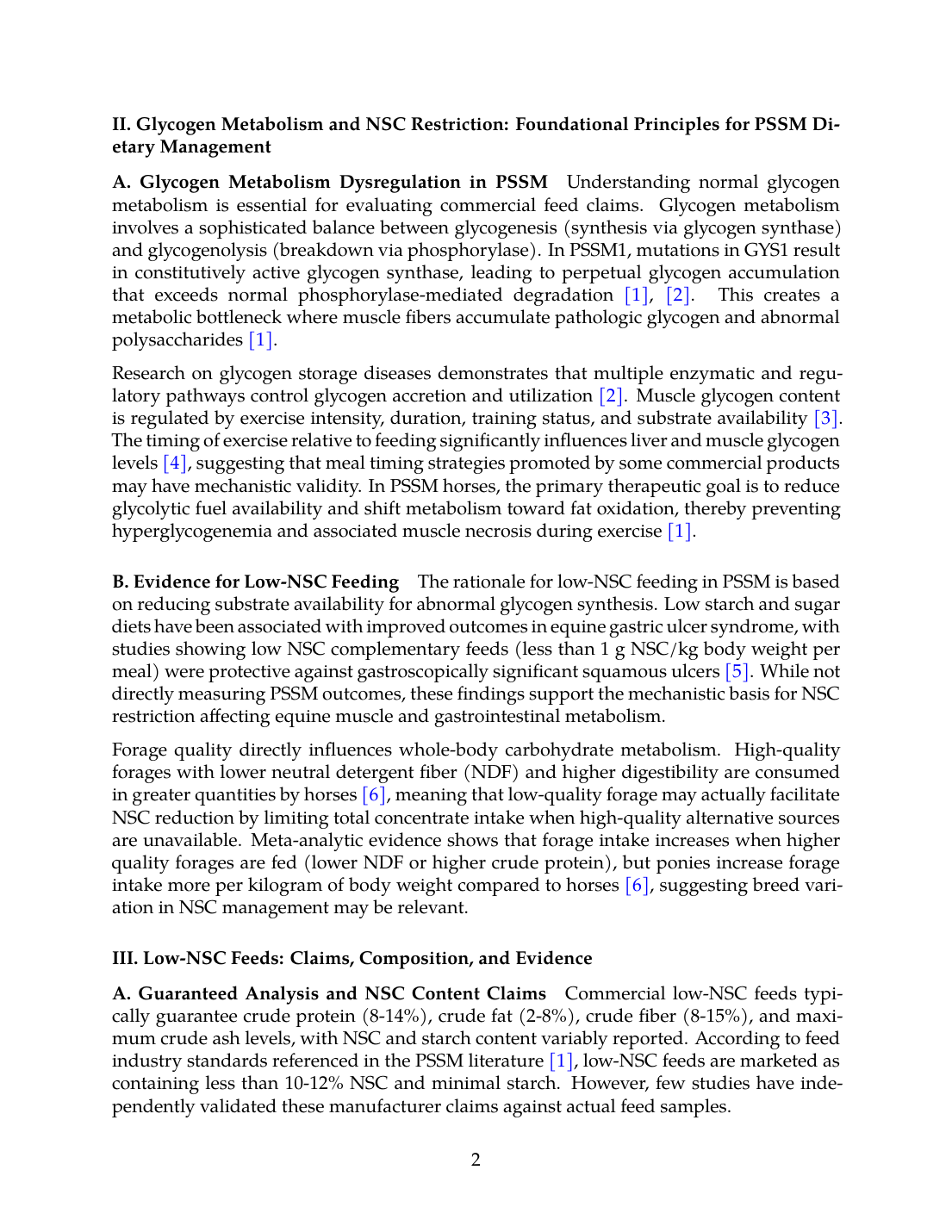 The rationale for low-NSC feeding in PSSM is based on reducing substrate availability for abnormal glycogen synthesis. Low starch and sugar diets have been associated with improved outcomes in equine gastric ulcer syndrome, with studies showing low NSC complementary feeds (less than 1 g NSC/kg body weight per meal) were protective against gastroscopically significant squamous ulcers [5]. While not directly measuring PSSM outcomes, these findings support the mechanistic basis for NSC restriction affecting equine muscle and gastrointestinal metabolism.