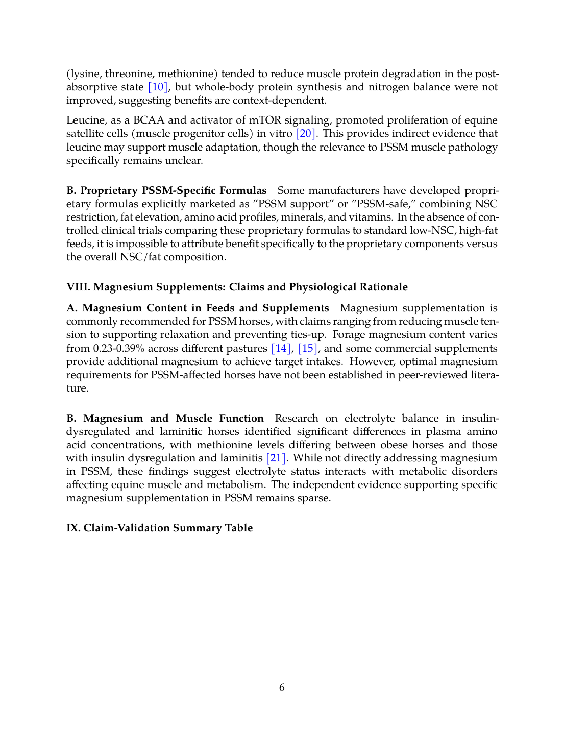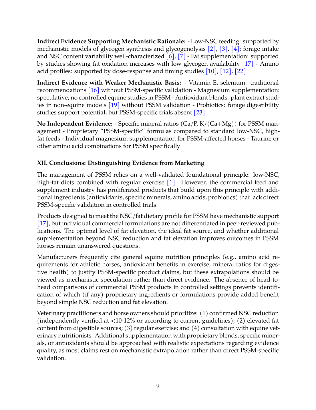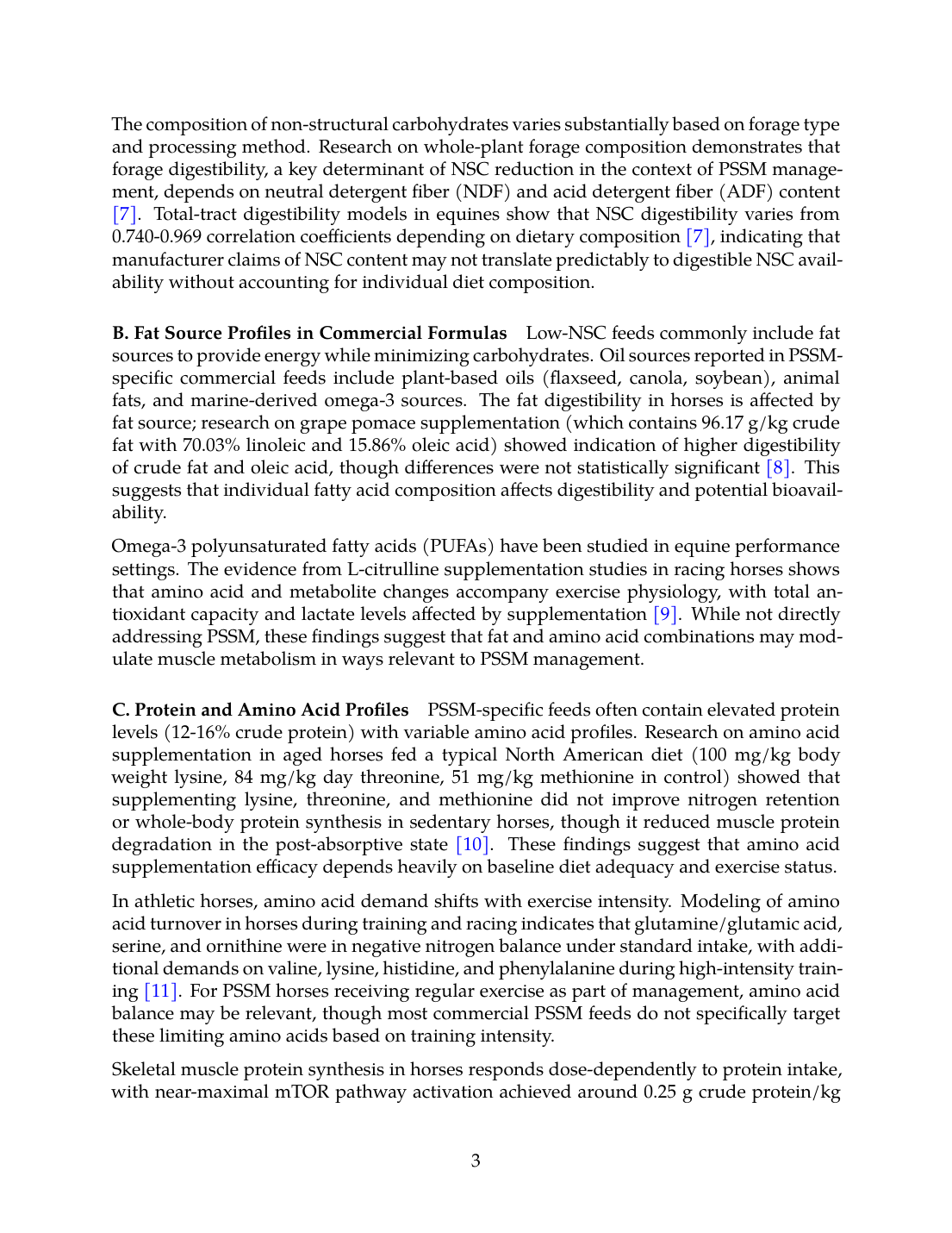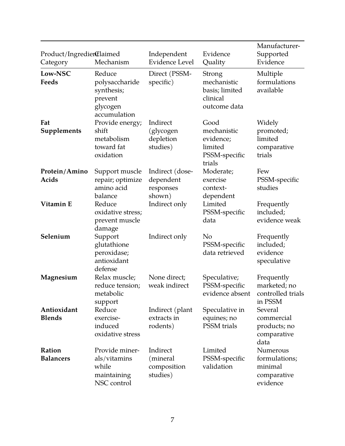 Several product categories have indirect supporting evidence: fat supplements benefit from mechanistic studies showing that low glycogen initiates fat oxidation [17]; amino acid supplements benefit from dose-response studies in horses [12]; forage quality studies demonstrate NSC and energy dynamics [7],[6]. However, none of these lines of evidence constitute direct validation of commercial PSSM product efficacy in controlled clinical settings.