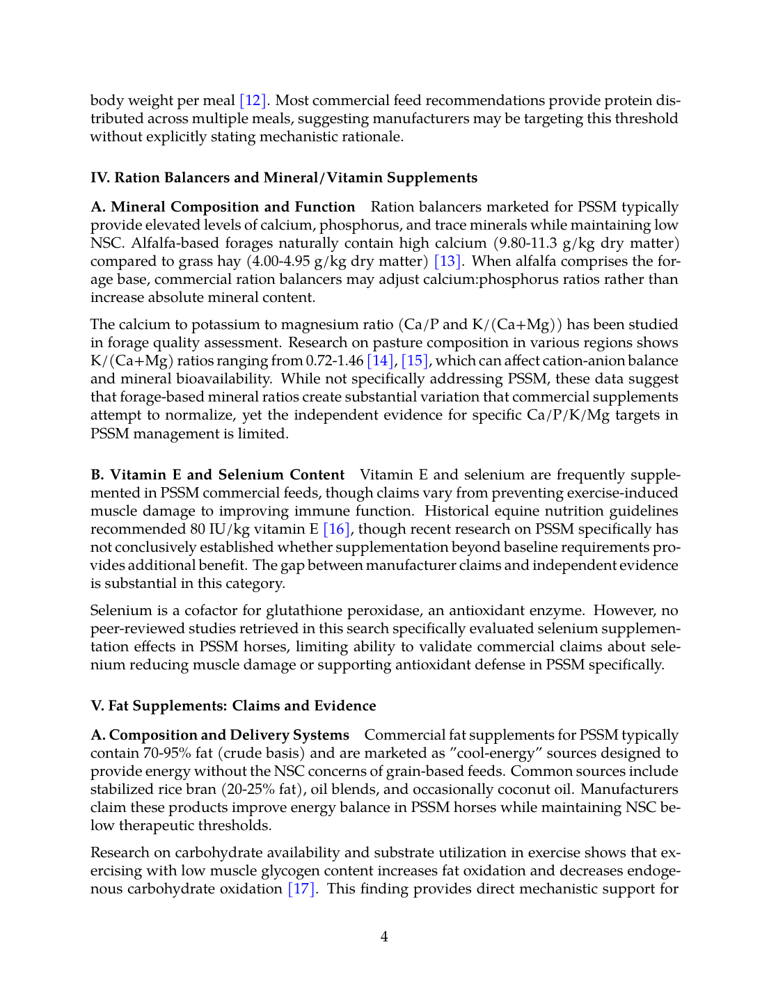 The calcium to potassium to magnesium ratio (Ca/P and K/(Ca+Mg)) has been studied in forage quality assessment. Research on pasture composition in various regions shows K/(Ca+Mg) ratios ranging from 0.72-1.46 [14],[15], which can affect cation-anion balance and mineral bioavailability. While not specifically addressing PSSM, these data suggest that forage-based mineral ratios create substantial variation that commercial supplements attempt to normalize, yet the independent evidence for specific Ca/P/K/Mg targets in PSSM management is limited.