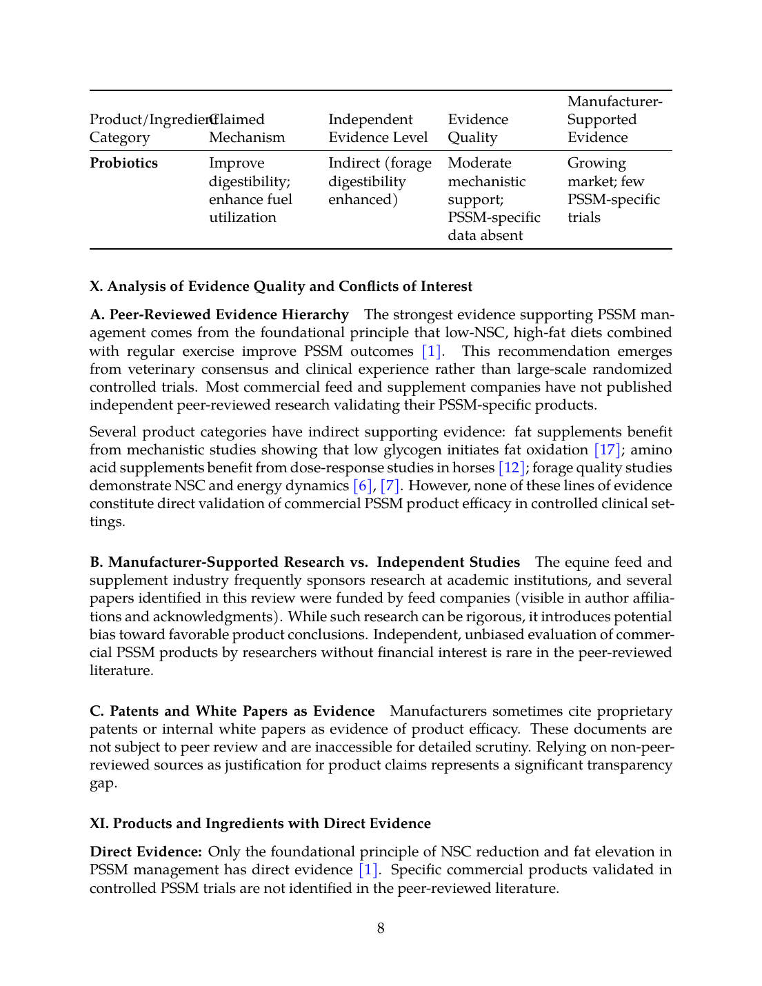 The equine feed and supplement industry frequently sponsors research at academic institutions, and several papers identified in this review were funded by feed companies (visible in author affiliations and acknowledgments). While such research can be rigorous, it introduces potential bias toward favorable product conclusions. Independent, unbiased evaluation of commercial PSSM products by researchers without financial interest is rare in the peer-reviewed literature.