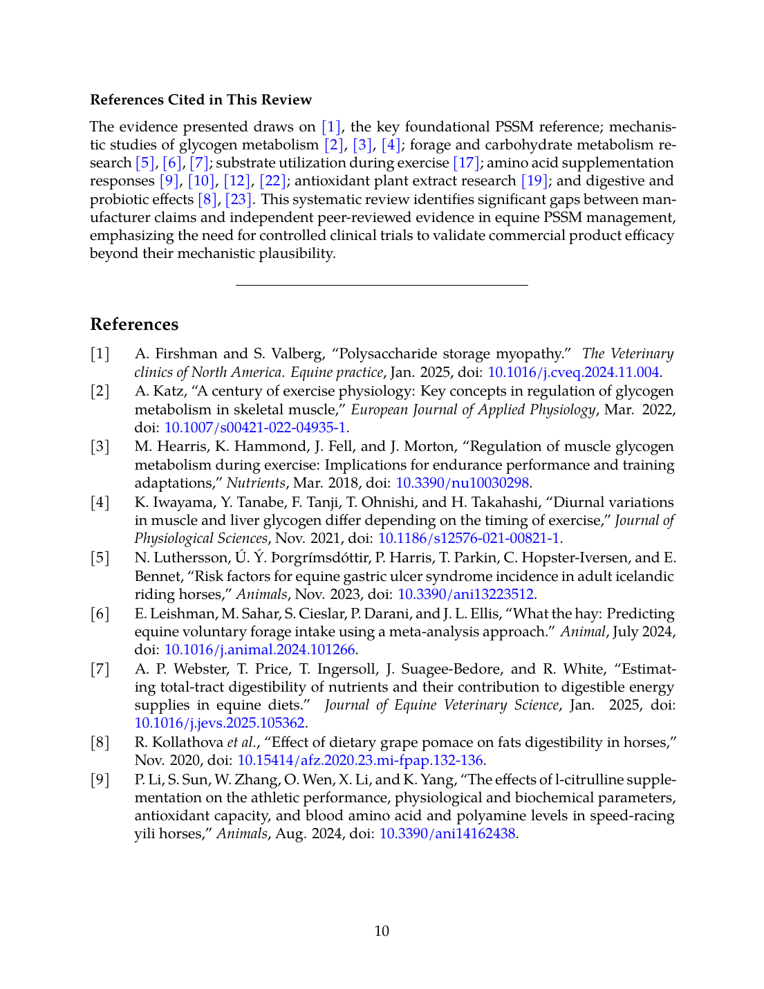 The evidence presented draws on [1], the key foundational PSSM reference; mechanistic studies of glycogen metabolism [2],[3],[4]; forage and carbohydrate metabolism research [7],[6],[5]; substrate utilization during exercise [17]; amino acid supplementation responses [10],[12],[22],[9]; antioxidant plant extract research [19]; and digestive and probiotic effects [23],[8]. This systematic review identifies significant gaps between manufacturer claims and independent peer-reviewed evidence in equine PSSM management, emphasizing the need for controlled clinical trials to validate commercial product efficacy beyond their mechanistic plausibility.