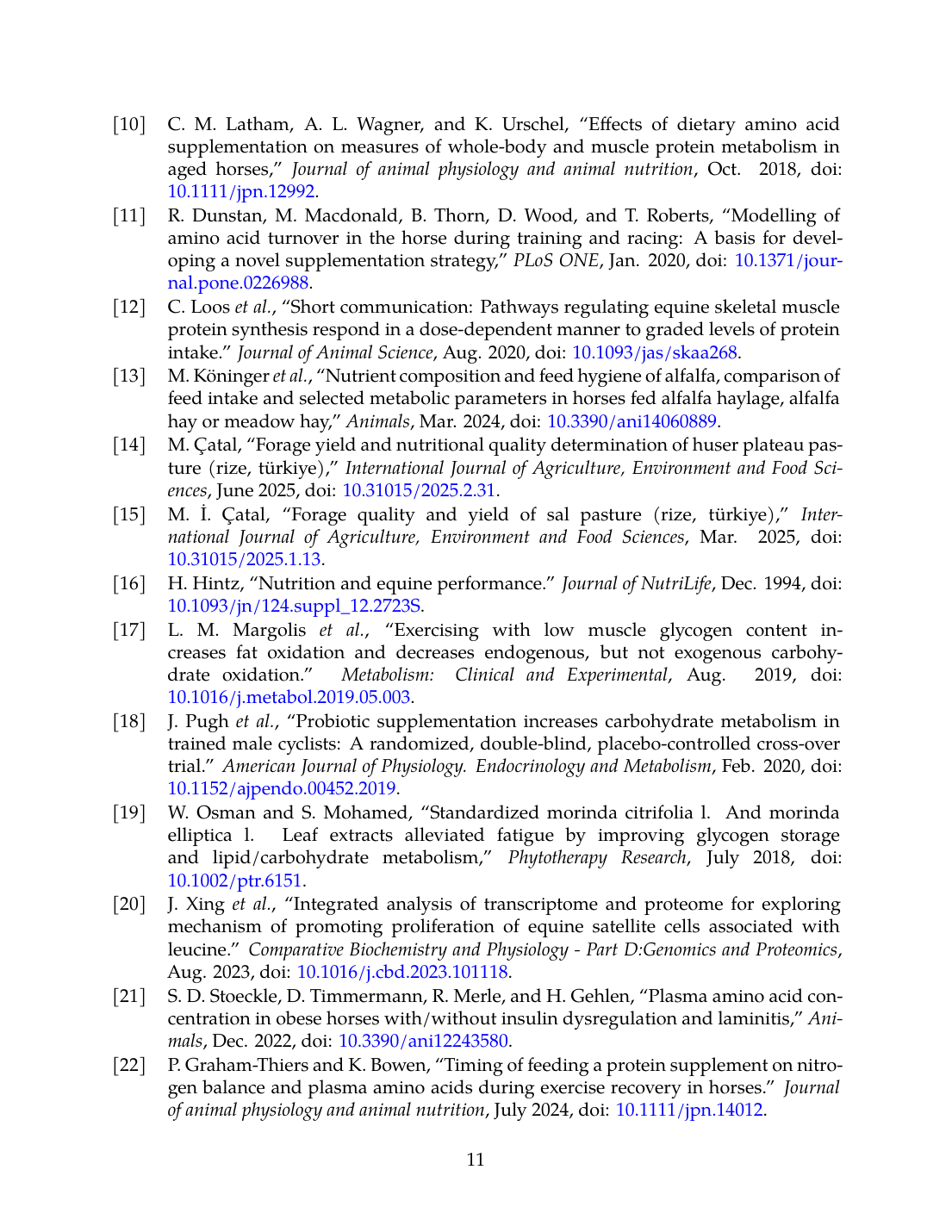 - C. Loos, K. McLeod, S. C. Stratton, D. A. van Doorn, I. Kalmar, E. Vanzant, and K. Urschel, “Short Communication: Pathways regulating equine skeletal muscle protein synthesis respond in a dose-dependent manner to graded levels of protein intake.,” Journal of Animal Science, Aug. 2020. doi: 10.1093/jas/skaa268. View source