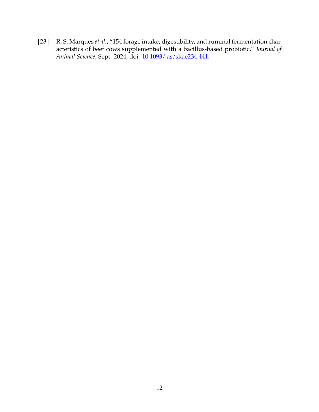 - R. S. Marques, A. Limede, V. Cruz, M. Ogg, I. A. Cidrini, A. C. M. D. Queiroz, F. Cidrini, I. Farias, A. N. Rodrigues, A. Motter, and B. Cappellozza, “154 Forage intake, digestibility, and ruminal fermentation characteristics of beef cows supplemented with a Bacillus-based probiotic,” Journal of Animal Science, Sep. 2024. doi: 10.1093/jas/skae234.441. View source