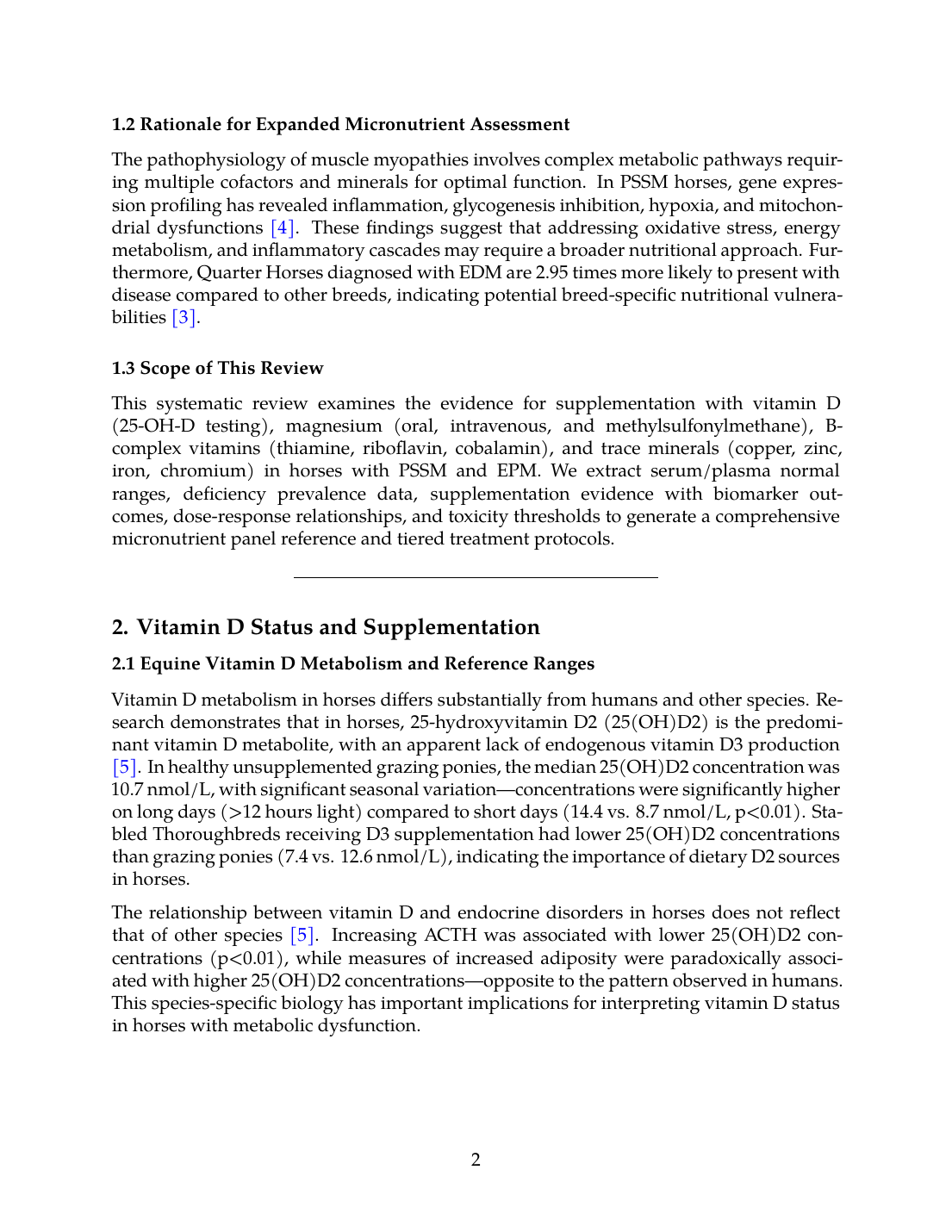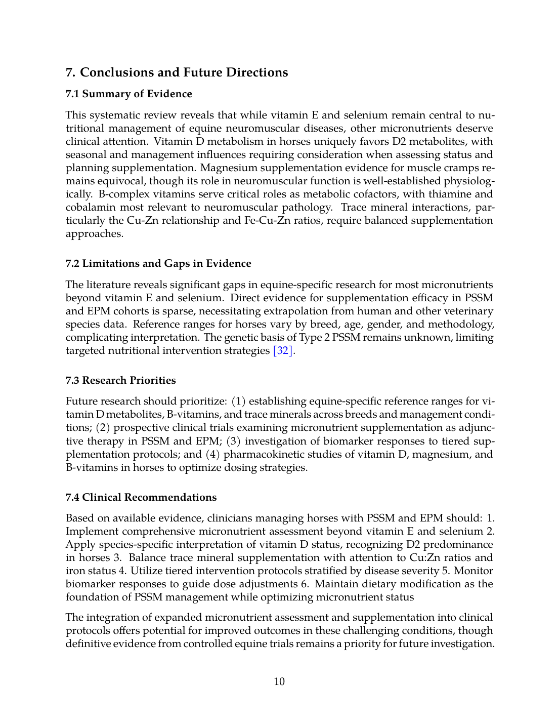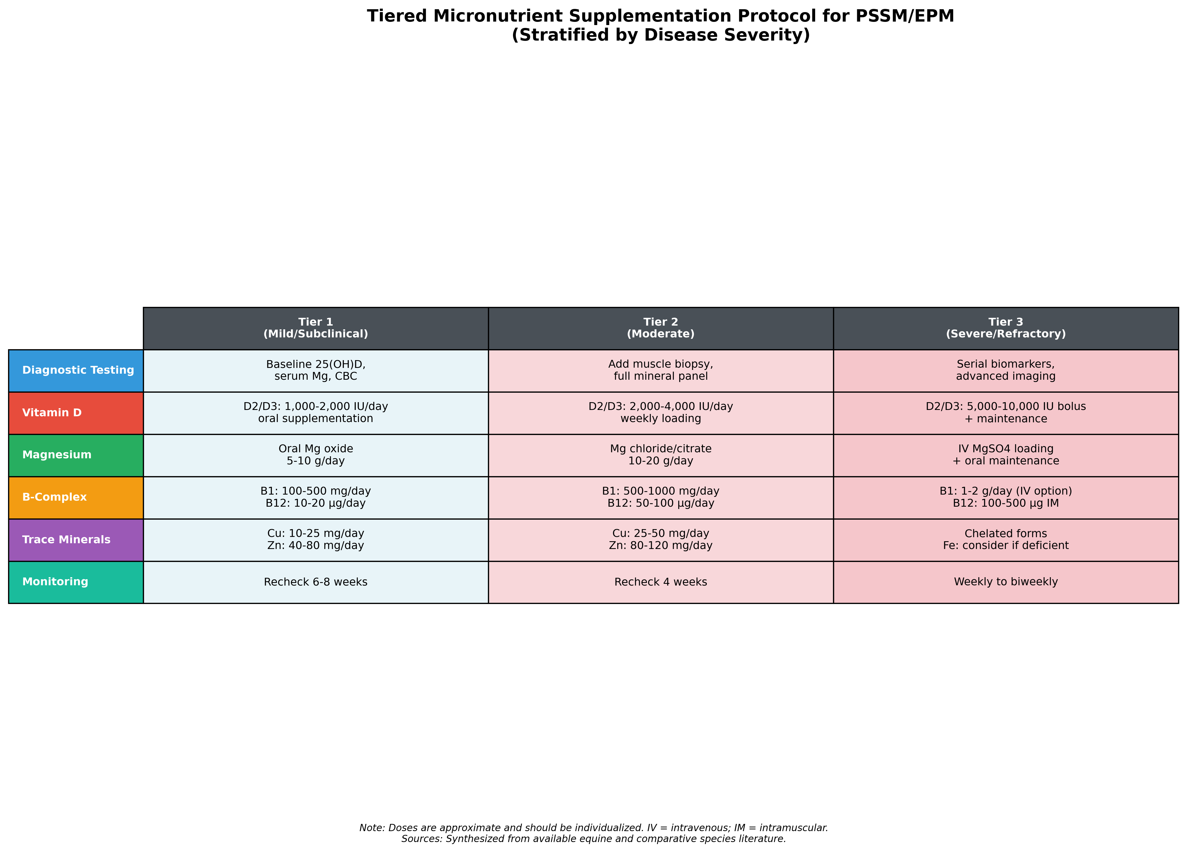 Future research should prioritize: (1) establishing equine-specific reference ranges for vitamin D metabolites, B-vitamins, and trace minerals across breeds and management conditions; (2) prospective clinical trials examining micronutrient supplementation as adjunctive therapy in PSSM and EPM; (3) investigation of biomarker responses to tiered supplementation protocols; and (4) pharmacokinetic studies of vitamin D, magnesium, and B-vitamins in horses to optimize dosing strategies.