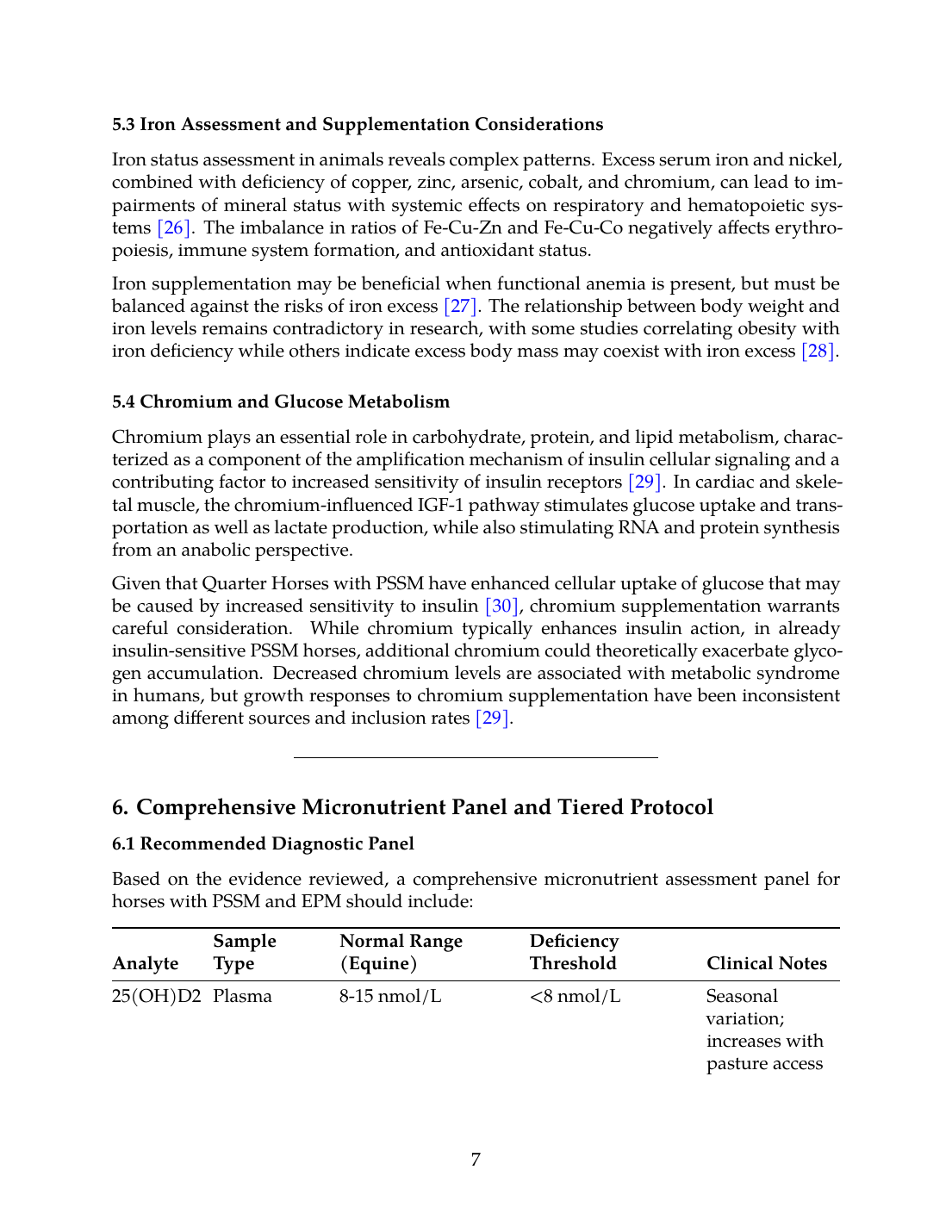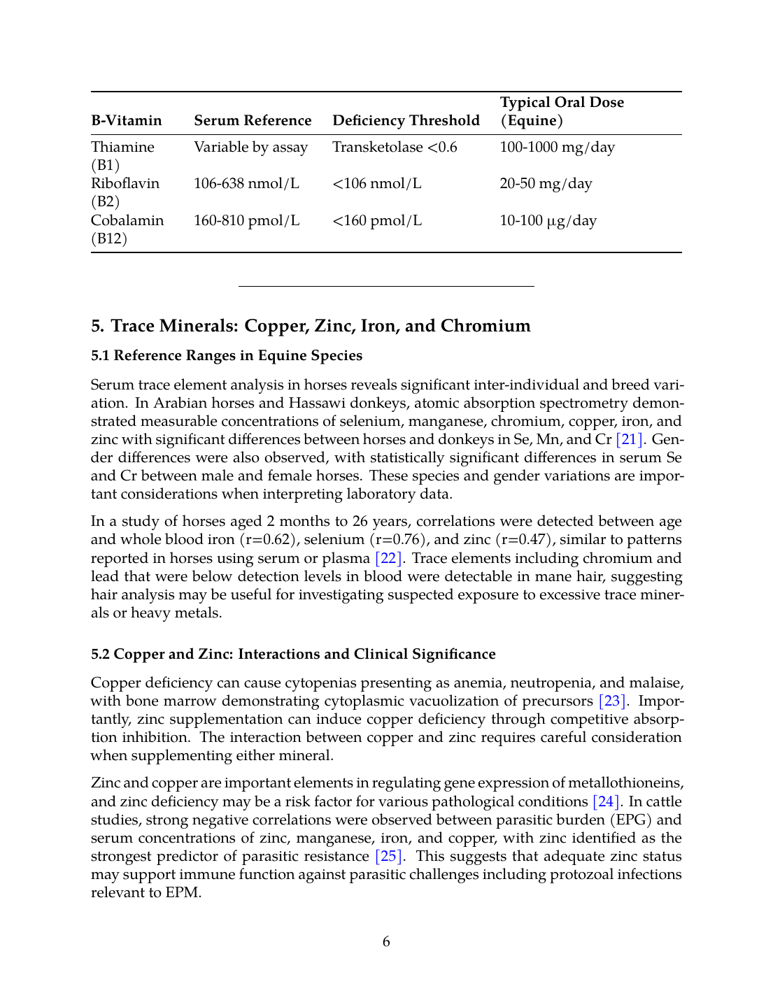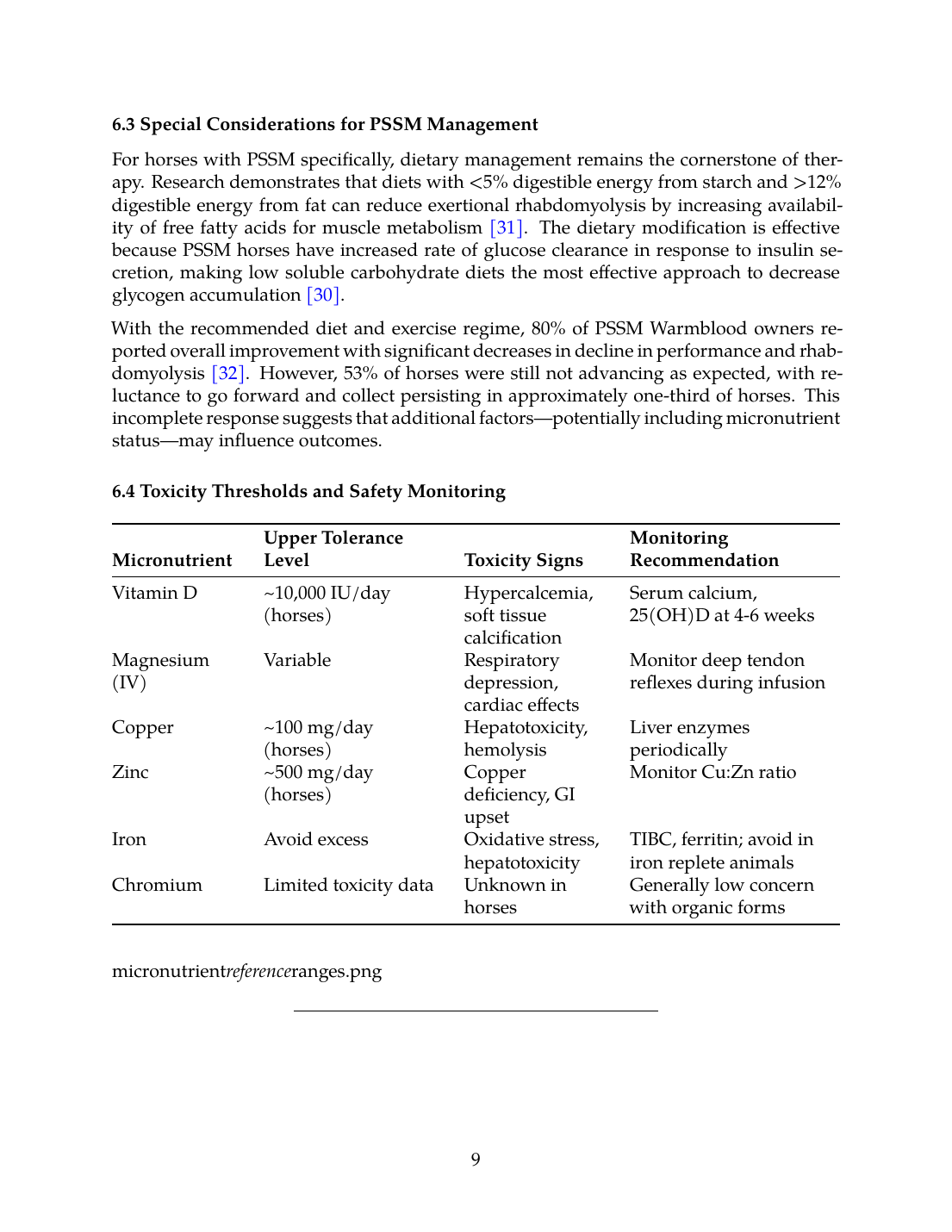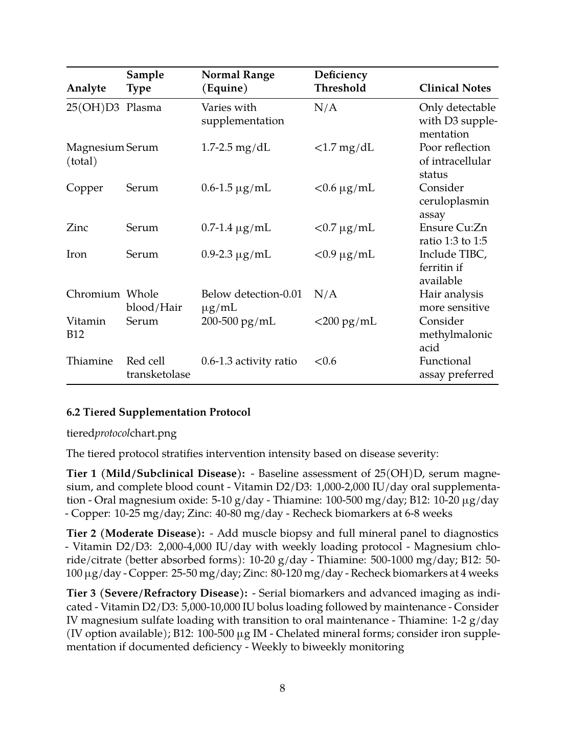 Future research should prioritize: (1) establishing equine-specific reference ranges for vitamin D metabolites, B-vitamins, and trace minerals across breeds and management conditions; (2) prospective clinical trials examining micronutrient supplementation as adjunctive therapy in PSSM and EPM; (3) investigation of biomarker responses to tiered supplementation protocols; and (4) pharmacokinetic studies of vitamin D, magnesium, and B-vitamins in horses to optimize dosing strategies.