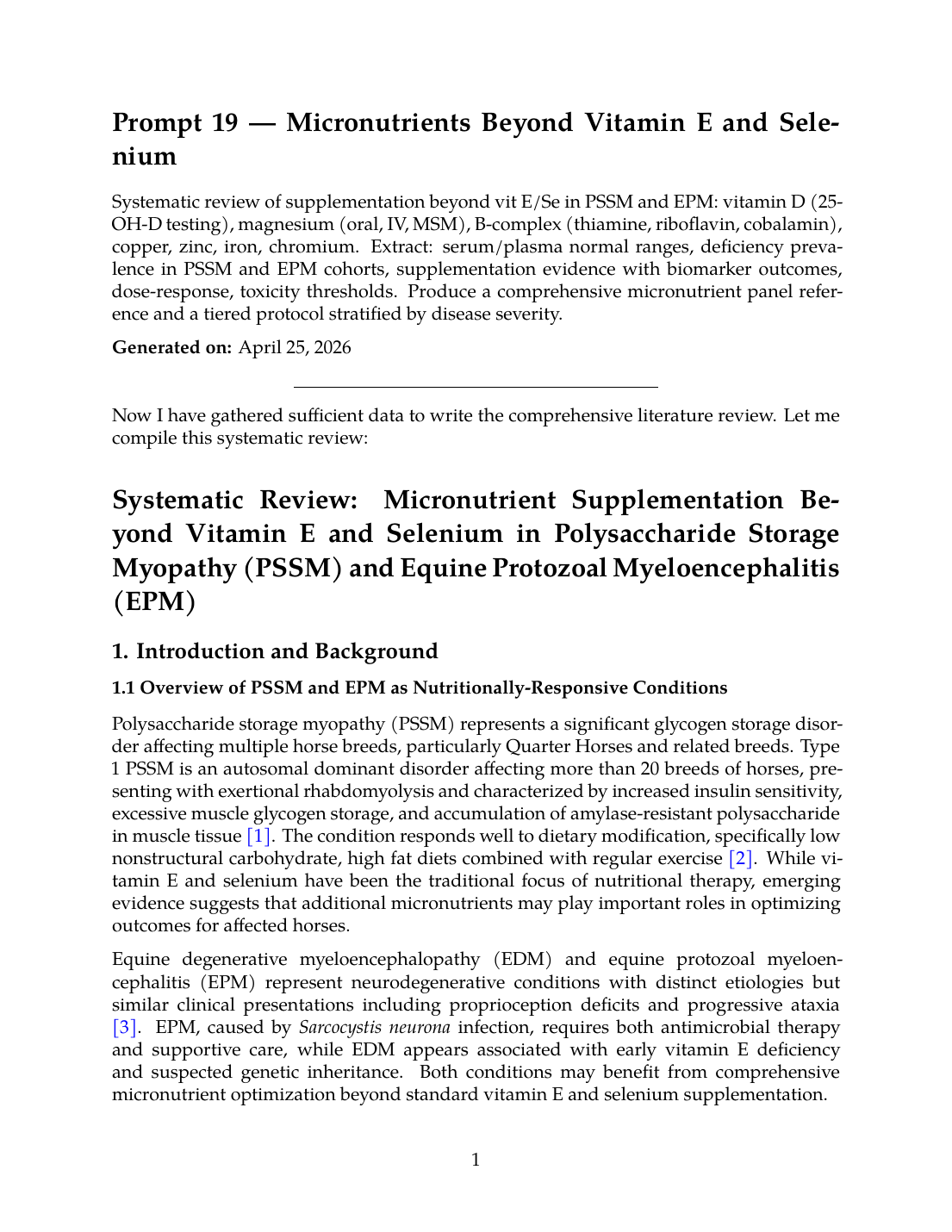 This systematic review examines the evidence for supplementation with vitamin D (25-OH-D testing), magnesium (oral, intravenous, and methylsulfonylmethane), B-complex vitamins (thiamine, riboflavin, cobalamin), and trace minerals (copper, zinc, iron, chromium) in horses with PSSM and EPM. We extract serum/plasma normal ranges, deficiency prevalence data, supplementation evidence with biomarker outcomes, dose-response relationships, and toxicity thresholds to generate a comprehensive micronutrient panel reference and tiered treatment protocols.