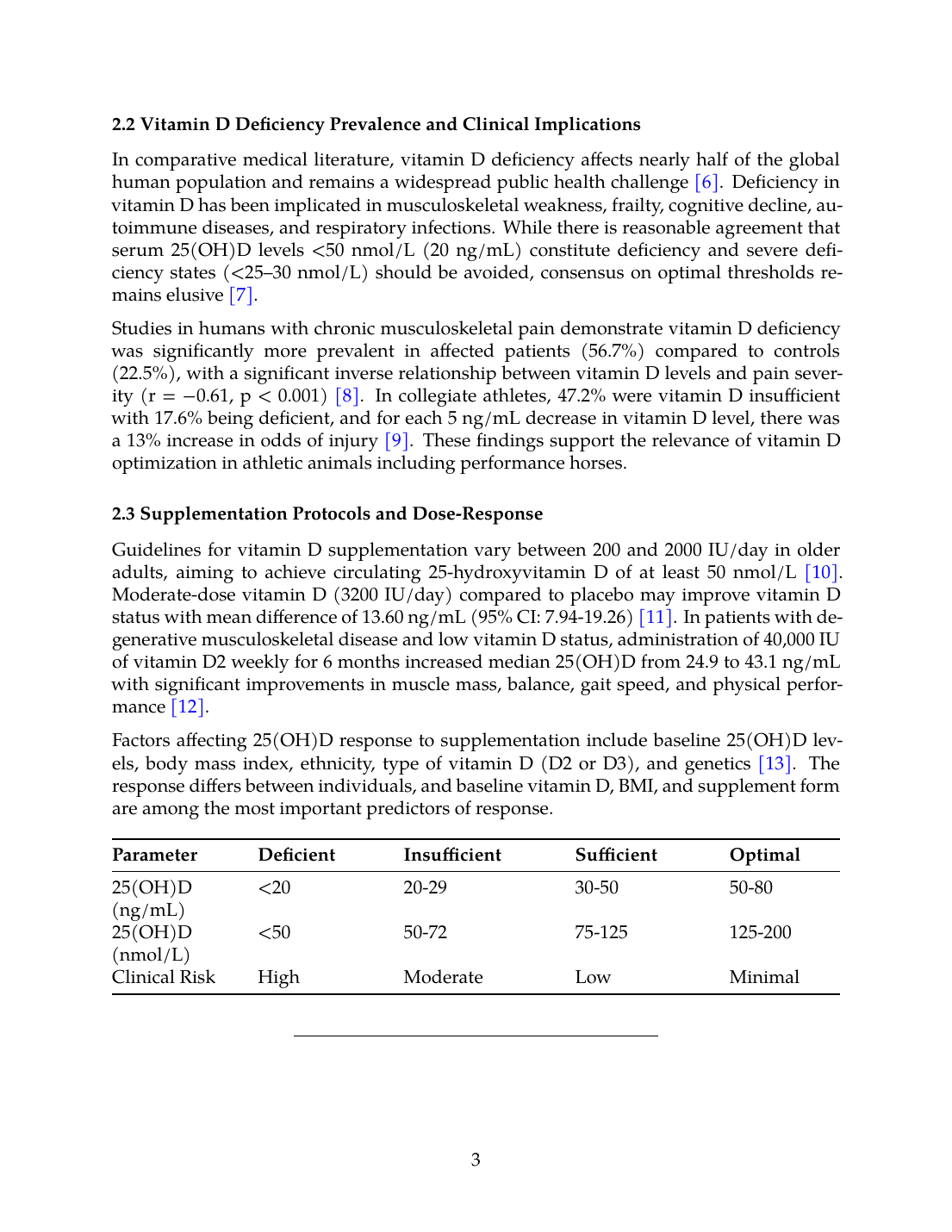 Studies in humans with chronic musculoskeletal pain demonstrate vitamin D deficiency was significantly more prevalent in affected patients (56.7%) compared to controls (22.5%), with a significant inverse relationship between vitamin D levels and pain severity (r = −0.61, p < 0.001) [8]. In collegiate athletes, 47.2% were vitamin D insufficient with 17.6% being deficient, and for each 5 ng/mL decrease in vitamin D level, there was a 13% increase in odds of injury [9]. These findings support the relevance of vitamin D optimization in athletic animals including performance horses.