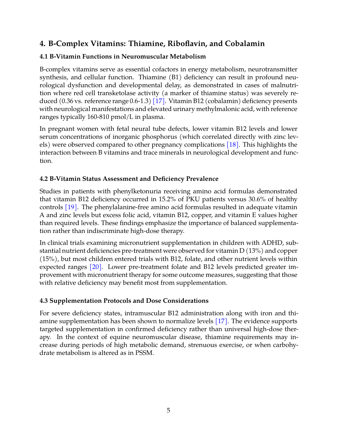 For severe deficiency states, intramuscular B12 administration along with iron and thiamine supplementation has been shown to normalize levels [17]. The evidence supports targeted supplementation in confirmed deficiency rather than universal high-dose therapy. In the context of equine neuromuscular disease, thiamine requirements may increase during periods of high metabolic demand, strenuous exercise, or when carbohydrate metabolism is altered as in PSSM.