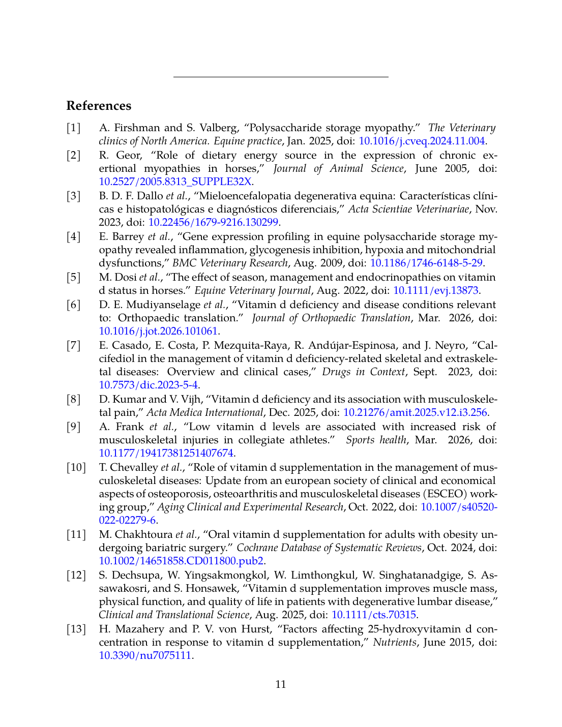 - M. Dosi, B. McGorum, R. D. Kirton, E. Cillán-García, R. Mellanby, J. Keen, E. Hurst, and R. Morgan, “The effect of season, management and endocrinopathies on vitamin D status in horses.,” Equine Veterinary Journal, Aug. 2022. doi: 10.1111/evj.13873. View source