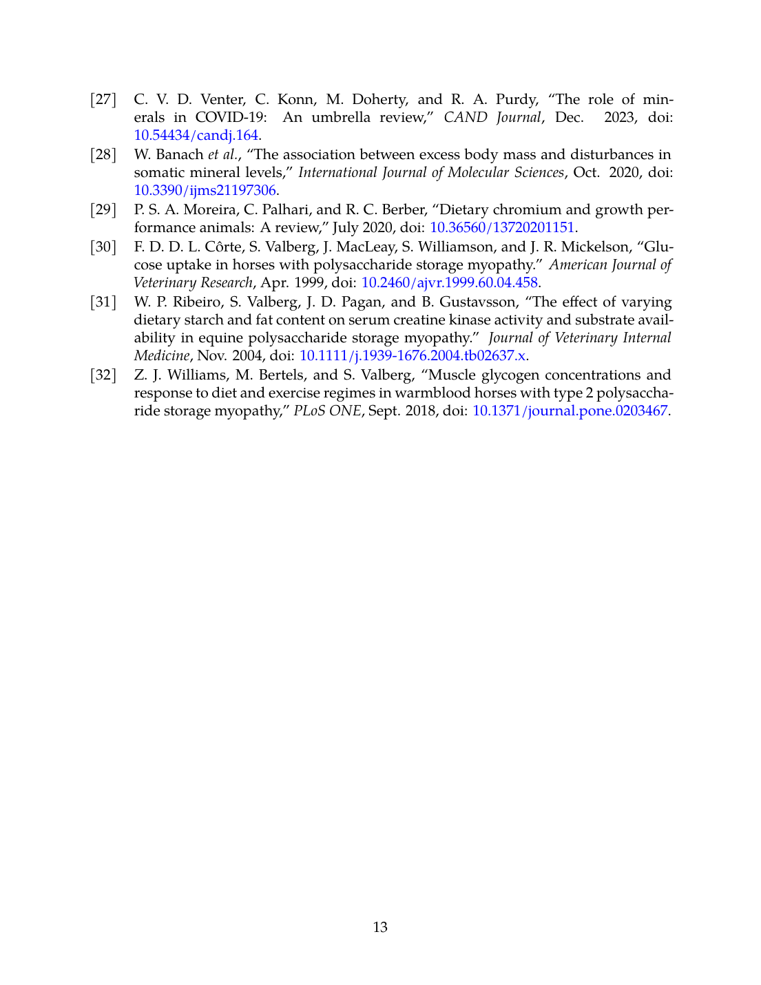 - W. P. Ribeiro, S. Valberg, J. D. Pagan, and B. Gustavsson, “The effect of varying dietary starch and fat content on serum creatine kinase activity and substrate availability in equine polysaccharide storage myopathy.,” Journal of Veterinary Internal Medicine, Nov. 2004. doi: 10.1111/j.1939-1676.2004.tb02637.x. View source