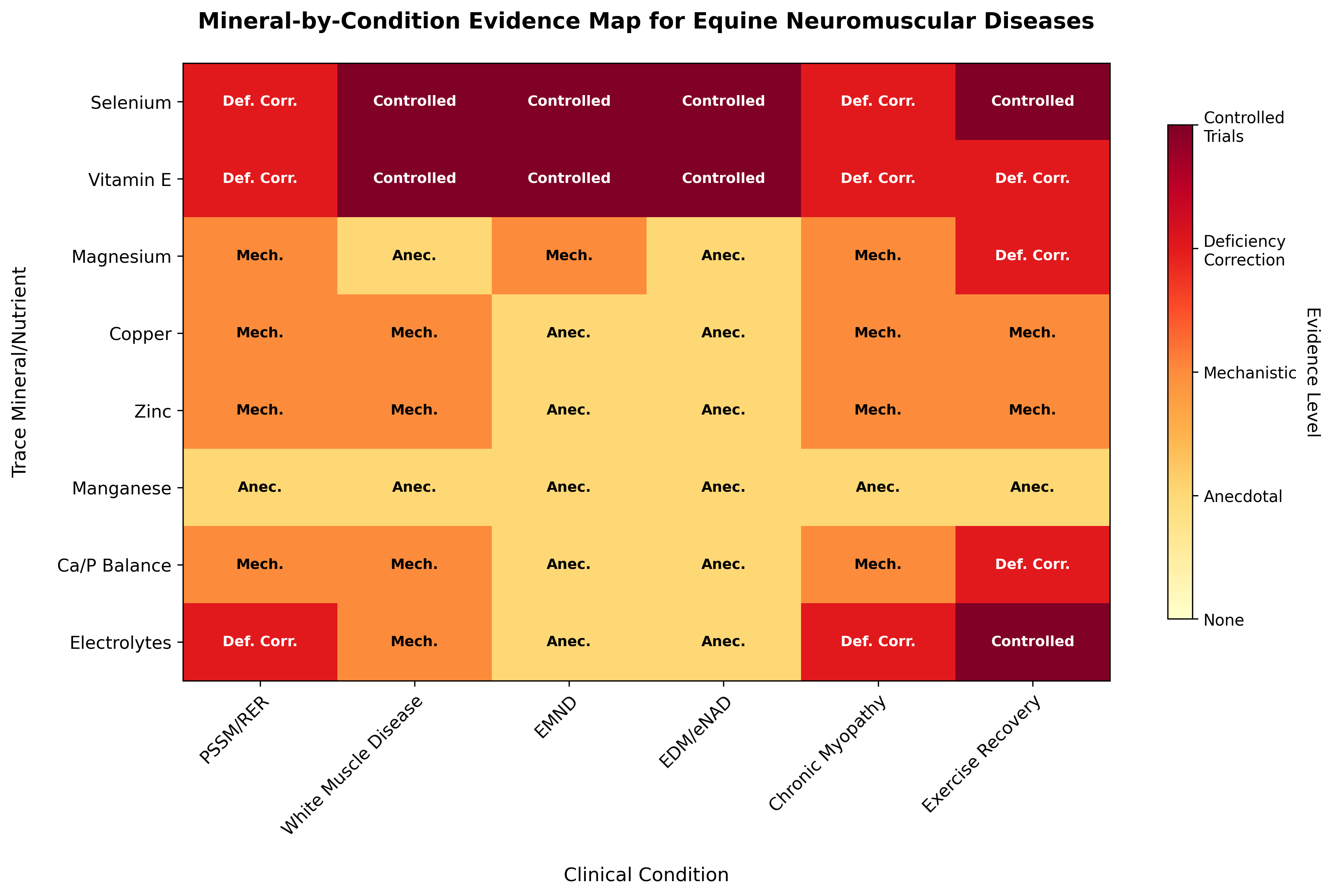 Figure 1: Mineral-by-condition evidence map showing the level of evidence supporting trace mineral interventions in equine neuromuscular diseases. Evidence levels range from anecdotal practice to controlled fe
