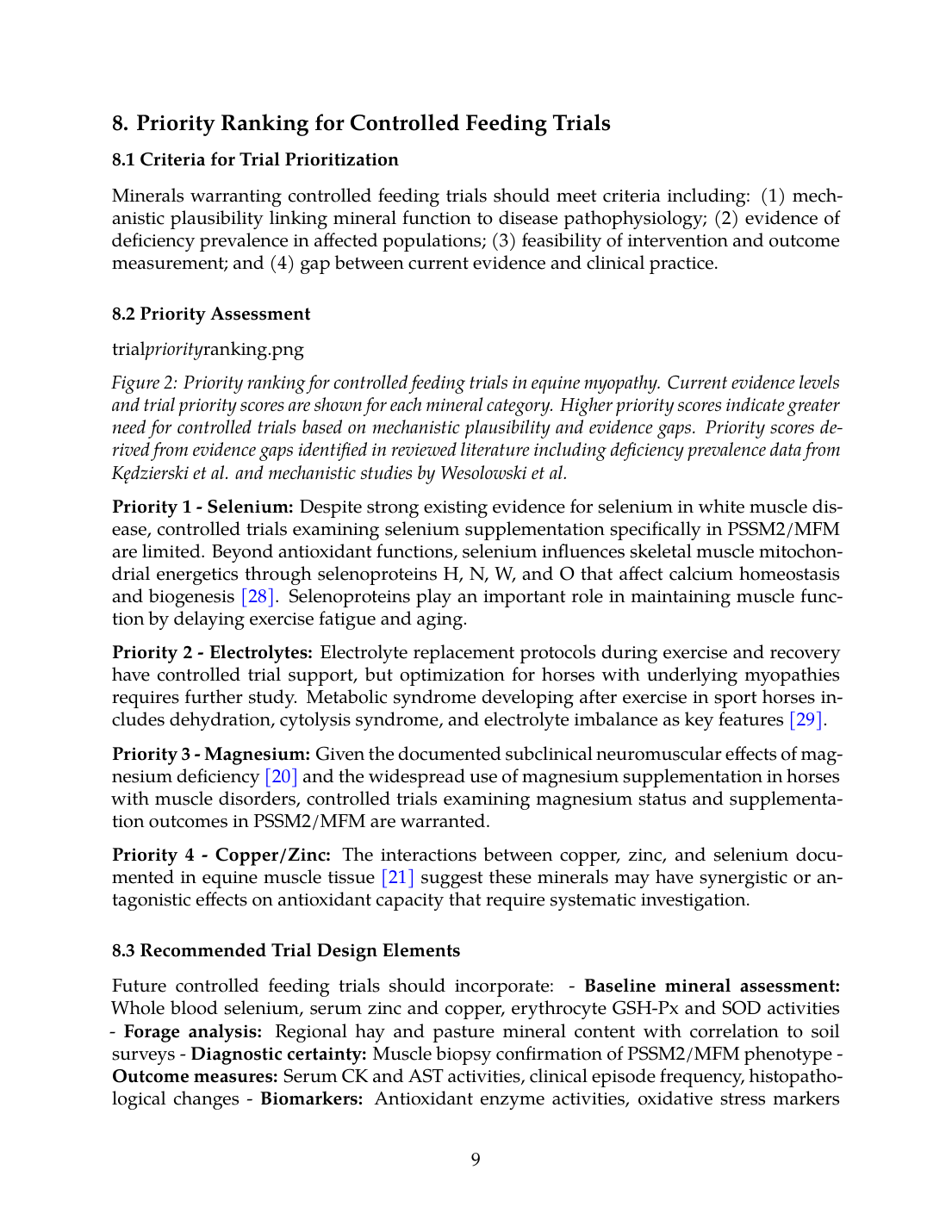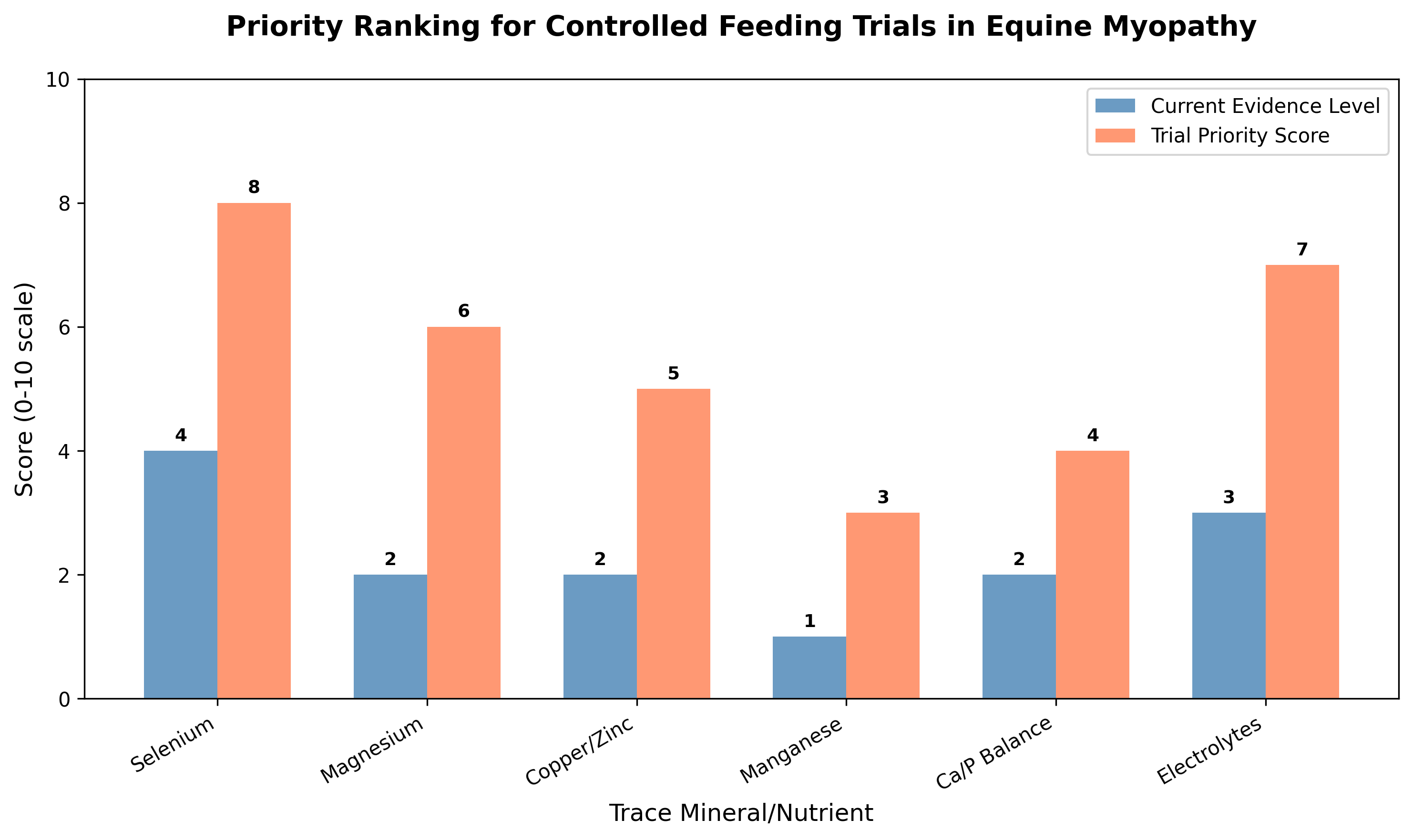 Figure 2: Priority ranking for controlled feeding trials in equine myopathy. Current evidence levels and trial priority scores are shown for each mineral category. Higher priority scores indicate greater need for controlled trials based on mechanistic plausibility and evidence gaps. Priority scores derived from evidence gaps identified in reviewed literature including deficiency prevalence data from Kędzierski et al. and mechanistic studies by Wesolowski et al.