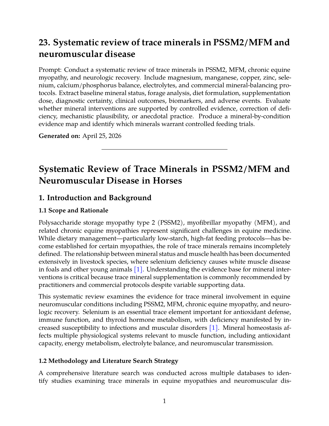 A comprehensive literature search was conducted across multiple databases to identify studies examining trace minerals in equine myopathies and neuromuscular diseases. The review encompasses magnesium, manganese, copper, zinc, selenium, calcium/phosphorus balance, and electrolytes. Data extraction focused on baseline mineral status, forage analysis, diet formulation, supplementation dose, diagnostic certainty, clinical outcomes, biomarkers, and adverse events. Evidence was categorized according to controlled trial data, deficiency correction studies, mechanistic plausibility, and anecdotal practice.