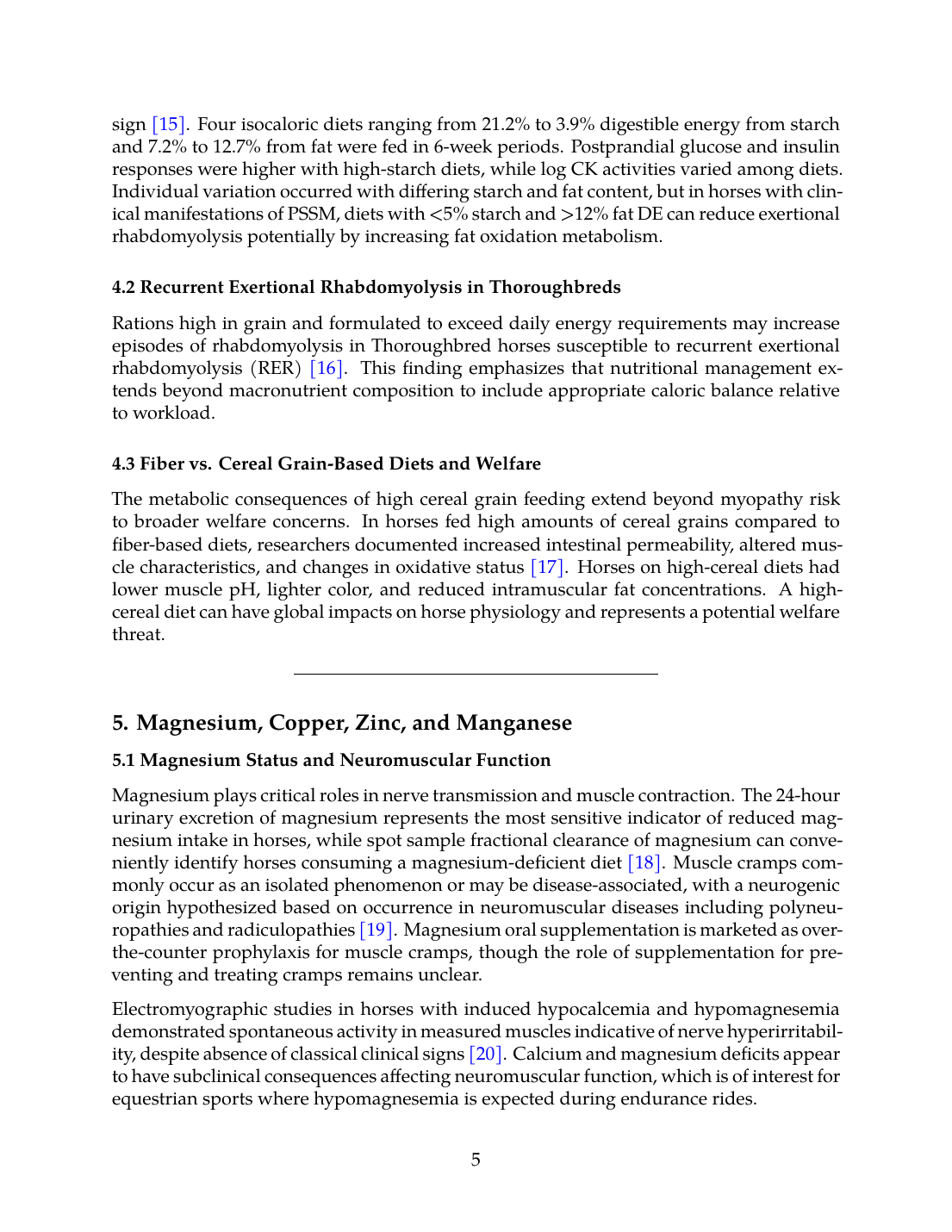 Rations high in grain and formulated to exceed daily energy requirements may increase episodes of rhabdomyolysis in Thoroughbred horses susceptible to recurrent exertional rhabdomyolysis (RER) [16]. This finding emphasizes that nutritional management extends beyond macronutrient composition to include appropriate caloric balance relative to workload.