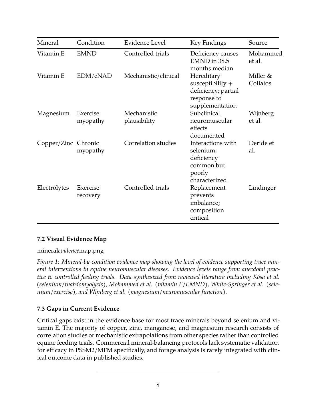 Figure 1: Mineral-by-condition evidence map showing the level of evidence supporting trace mineral interventions in equine neuromuscular diseases. Evidence levels range from anecdotal practice to controlled feeding trials. Data synthesized from reviewed literature including Kósa et al. (selenium/rhabdomyolysis), Mohammed et al. (vitamin E/EMND), White-Springer et al. (selenium/exercise), and Wijnberg et al. (magnesium/neuromuscular function).