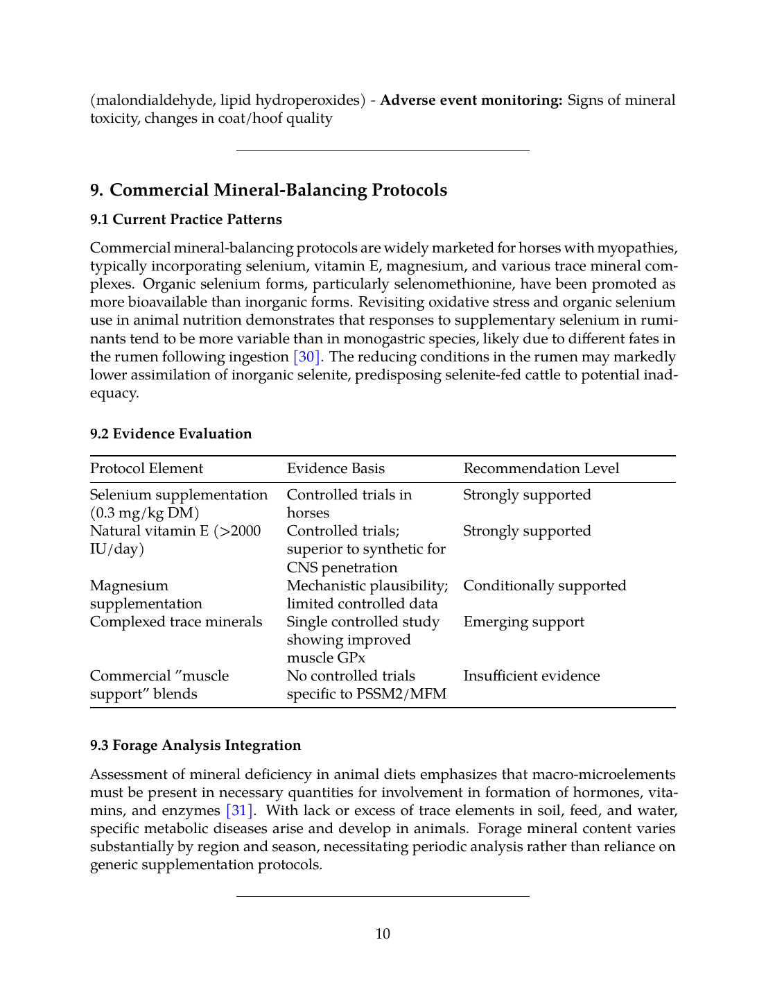 Critical gaps exist in the evidence base for most trace minerals beyond selenium and vitamin E. The majority of copper, zinc, manganese, and magnesium research consists of correlation studies or mechanistic extrapolations from other species rather than controlled equine feeding trials. Commercial mineral-balancing protocols lack systematic validation for efficacy in PSSM2/MFM specifically, and forage analysis is rarely integrated with clinical outcome data in published studies.