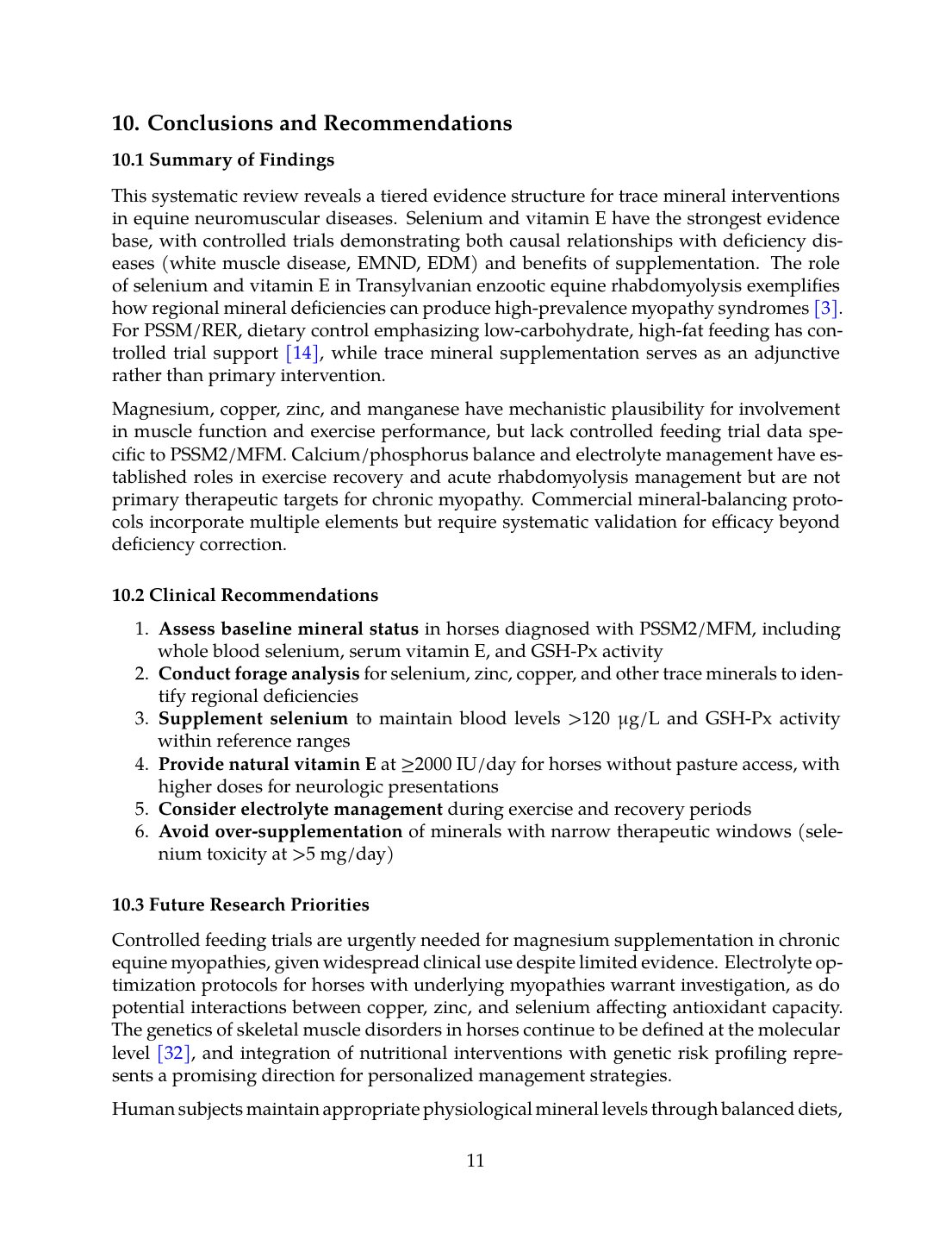 Controlled feeding trials are urgently needed for magnesium supplementation in chronic equine myopathies, given widespread clinical use despite limited evidence. Electrolyte optimization protocols for horses with underlying myopathies warrant investigation, as do potential interactions between copper, zinc, and selenium affecting antioxidant capacity. The genetics of skeletal muscle disorders in horses continue to be defined at the molecular level [32], and integration of nutritional interventions with genetic risk profiling represents a promising direction for personalized management strategies.