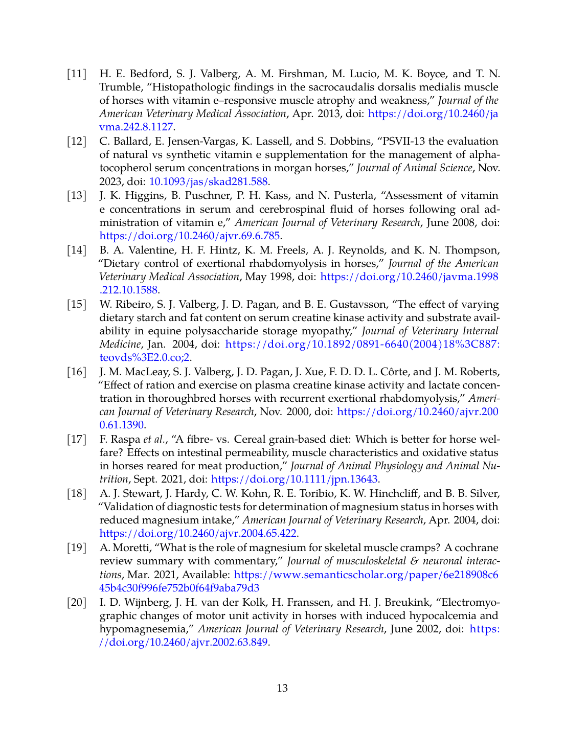 - H. E. Bedford, S. J. Valberg, A. M. Firshman, M. Lucio, M. K. Boyce, and T. N. Trumble, “Histopathologic findings in the sacrocaudalis dorsalis medialis muscle of horses with vitamin E–responsive muscle atrophy and weakness,” Journal of the American Veterinary Medical Association, Apr. 2013. doi: 10.2460/javma.242.8.1127. View source