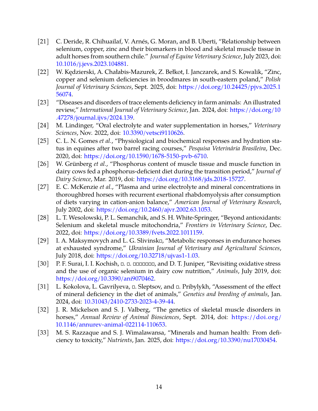 - C. Deride, R. Chihuailaf, V. Arnés, G. Moran, and B. Uberti, “Relationship between selenium, copper, zinc and their biomarkers in blood and skeletal muscle tissue in adult horses from southern Chile.,” Journal of Equine Veterinary Science, Jul. 2023. doi: 10.1016/j.jevs.2023.104881. View source