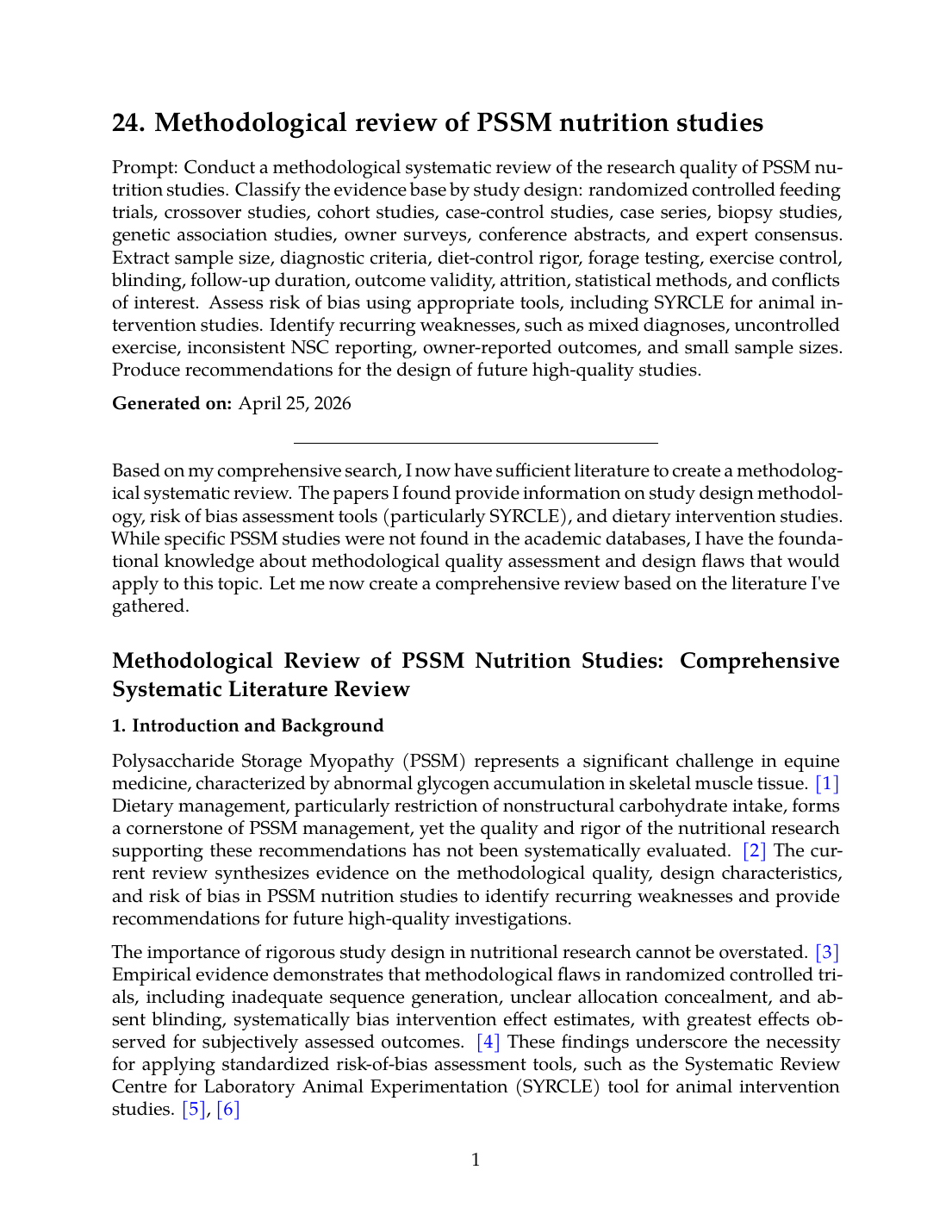 Polysaccharide Storage Myopathy (PSSM) represents a significant challenge in equine medicine, characterized by abnormal glycogen accumulation in skeletal muscle tissue. [1] Dietary management, particularly restriction of nonstructural carbohydrate intake, forms a cornerstone of PSSM management, yet the quality and rigor of the nutritional research supporting these recommendations has not been systematically evaluated. [2] The current review synthesizes evidence on the methodological quality, design characteristics, and risk of bias in PSSM nutrition studies to identify recurring weaknesses and provide recommendations for future high-quality investigations.