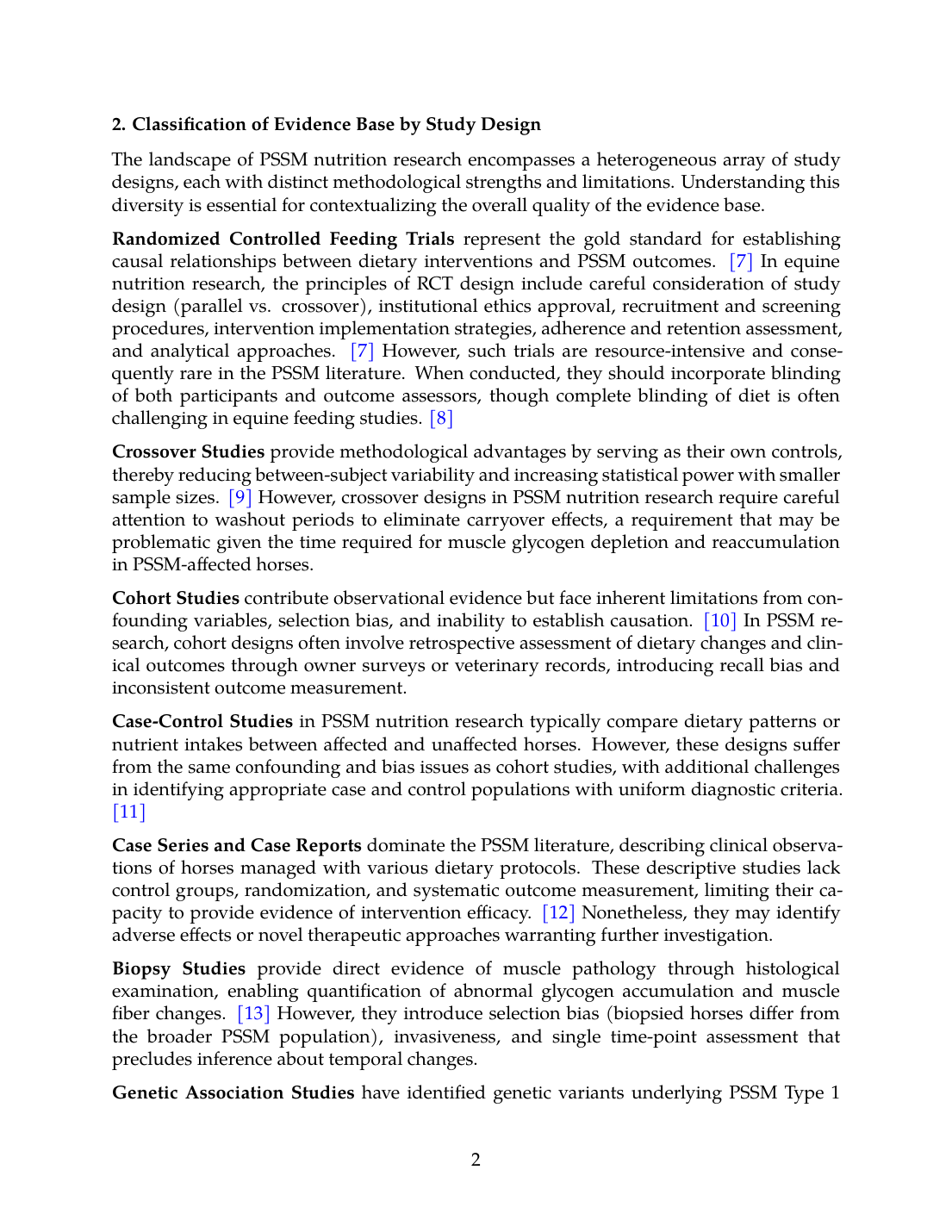 Case Series and Case Reports dominate the PSSM literature, describing clinical observations of horses managed with various dietary protocols. These descriptive studies lack control groups, randomization, and systematic outcome measurement, limiting their capacity to provide evidence of intervention efficacy. [12] Nonetheless, they may identify adverse effects or novel therapeutic approaches warranting further investigation.