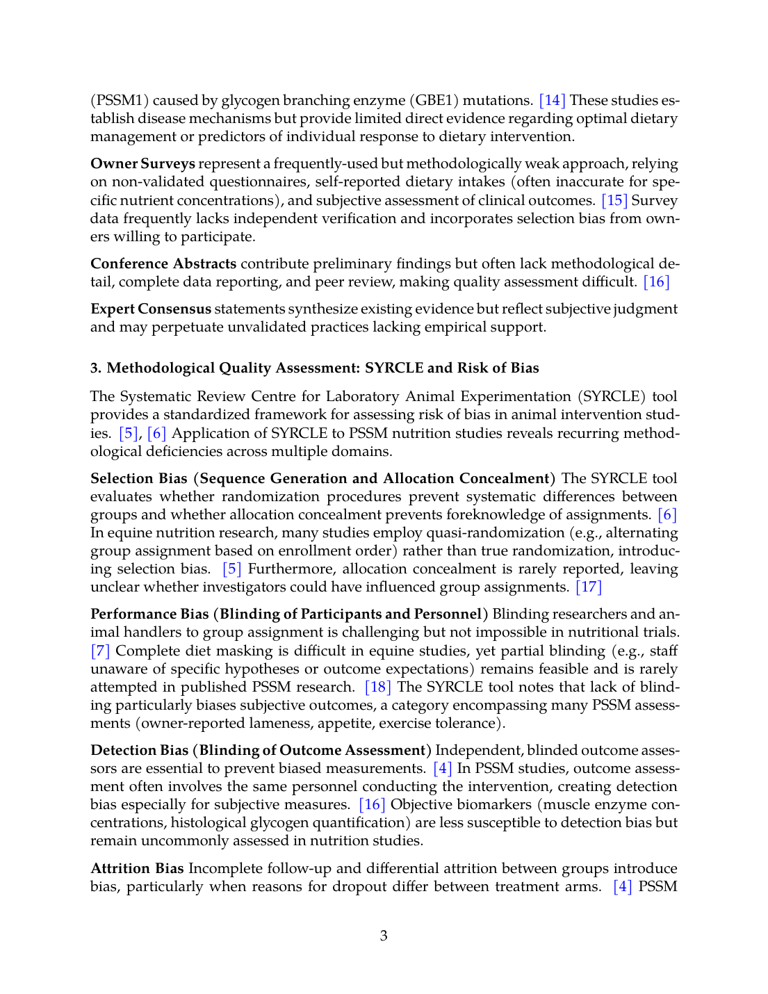 Performance Bias (Blinding of Participants and Personnel) Blinding researchers and animal handlers to group assignment is challenging but not impossible in nutritional trials. [7] Complete diet masking is difficult in equine studies, yet partial blinding (e.g., staff unaware of specific hypotheses or outcome expectations) remains feasible and is rarely attempted in published PSSM research. [18] The SYRCLE tool notes that lack of blinding particularly biases subjective outcomes, a category encompassing many PSSM assessments (owner-reported lameness, appetite, exercise tolerance).