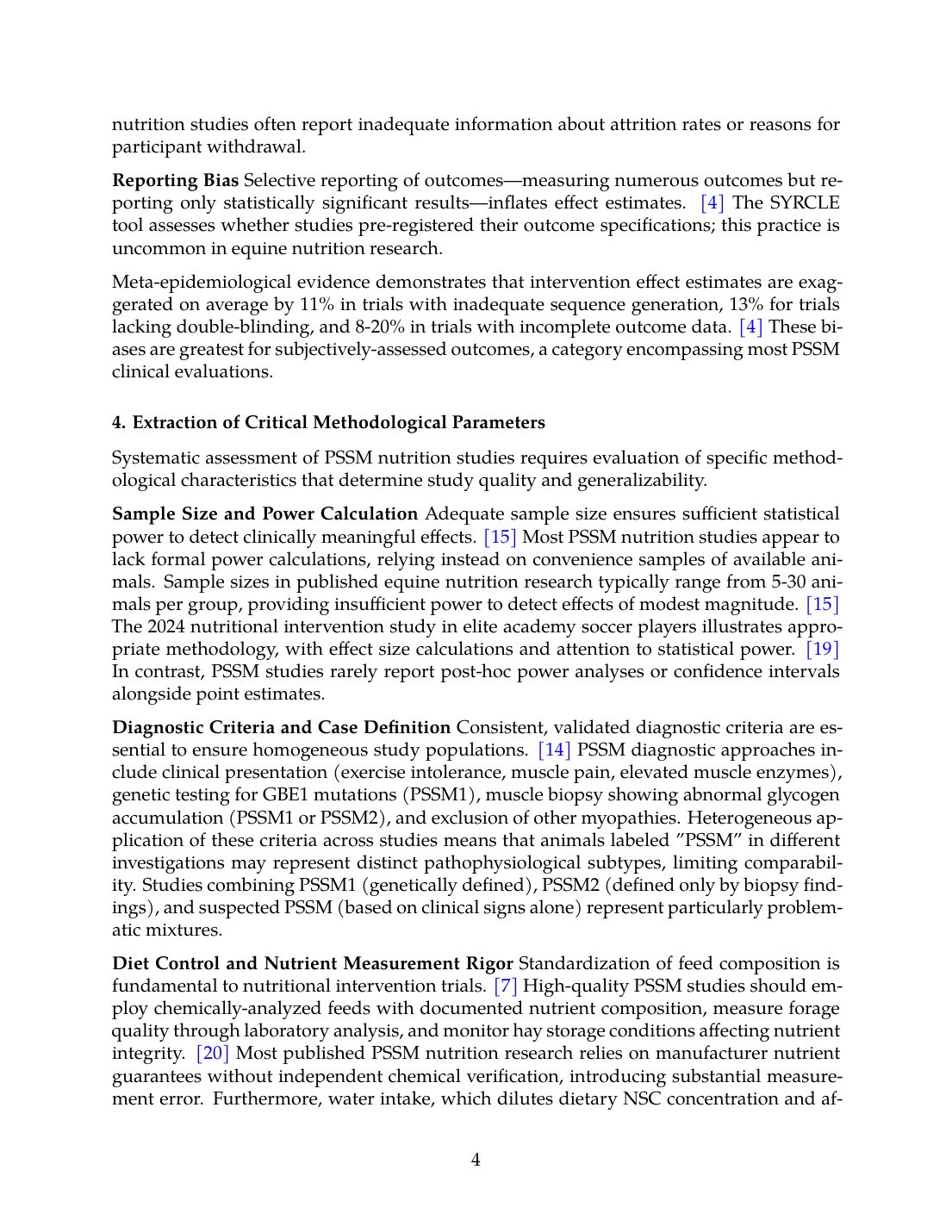 Absence of Pre-Registration and Protocol Specification Pre-registration of study protocols in clinical trial registries (e.g., ClinicalTrials.gov) mitigates selective outcome reporting. [7] This practice is uncommon in equine PSSM research, leaving uncertain whether reported outcomes were pre-specified or selected post-hoc based on statistical significance.