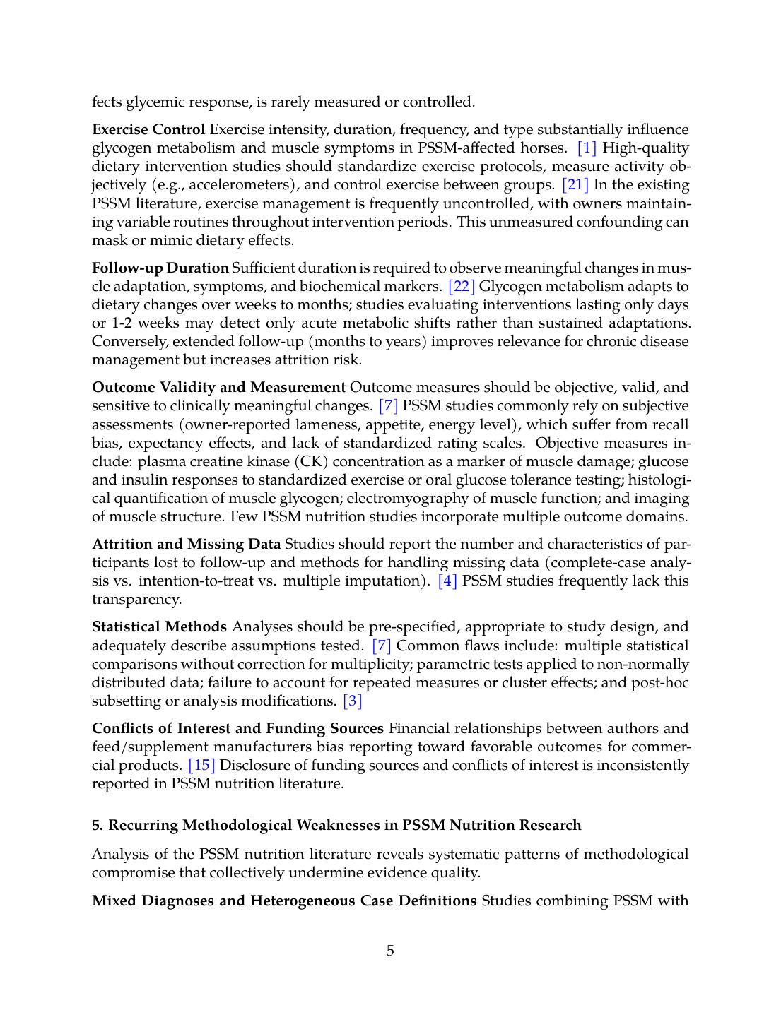 Exercise Control Exercise intensity, duration, frequency, and type substantially influence glycogen metabolism and muscle symptoms in PSSM-affected horses. [1] High-quality dietary intervention studies should standardize exercise protocols, measure activity objectively (e.g., accelerometers), and control exercise between groups. [21] In the existing PSSM literature, exercise management is frequently uncontrolled, with owners maintaining variable routines throughout intervention periods. This unmeasured confounding can mask or mimic dietary effects.