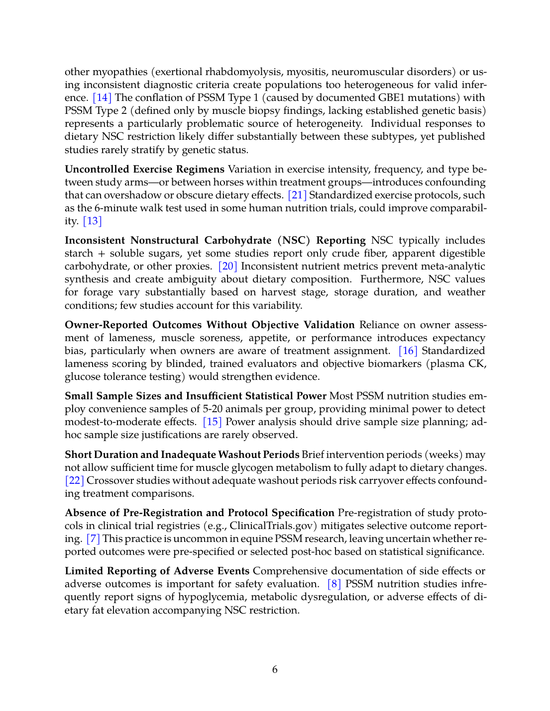Mixed Diagnoses and Heterogeneous Case Definitions Studies combining PSSM with other myopathies (exertional rhabdomyolysis, myositis, neuromuscular disorders) or using inconsistent diagnostic criteria create populations too heterogeneous for valid inference. [14] The conflation of PSSM Type 1 (caused by documented GBE1 mutations) with PSSM Type 2 (defined only by muscle biopsy findings, lacking established genetic basis) represents a particularly problematic source of heterogeneity. Individual responses to dietary NSC restriction likely differ substantially between these subtypes, yet published studies rarely stratify by genetic status.