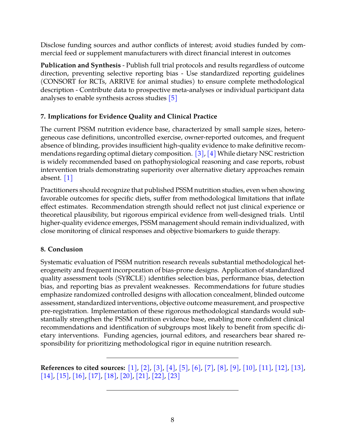 Conflicts of Interest and Funding Sources Financial relationships between authors and feed/supplement manufacturers bias reporting toward favorable outcomes for commercial products. [15] Disclosure of funding sources and conflicts of interest is inconsistently reported in PSSM nutrition literature.