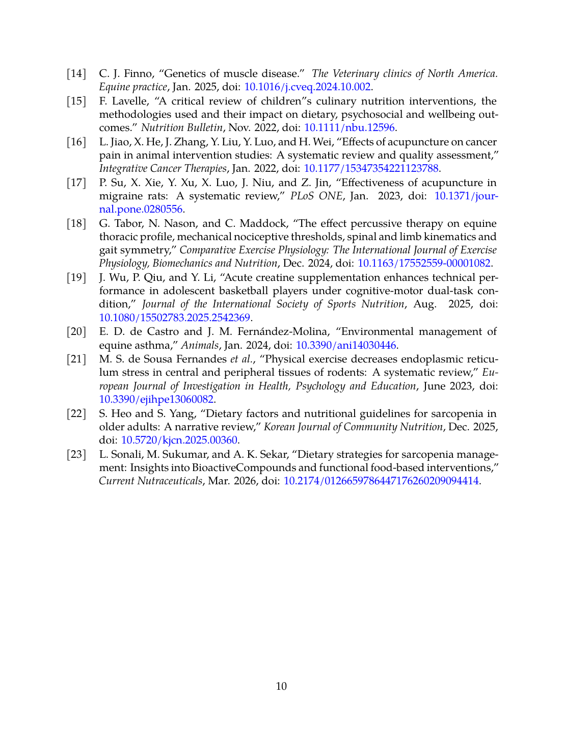 14. C. J. Finno, “Genetics of Muscle Disease.,” The Veterinary clinics of North America. Equine practice, Jan. 2025. doi: 10.1016/j.cveq.2024.10.002. View source