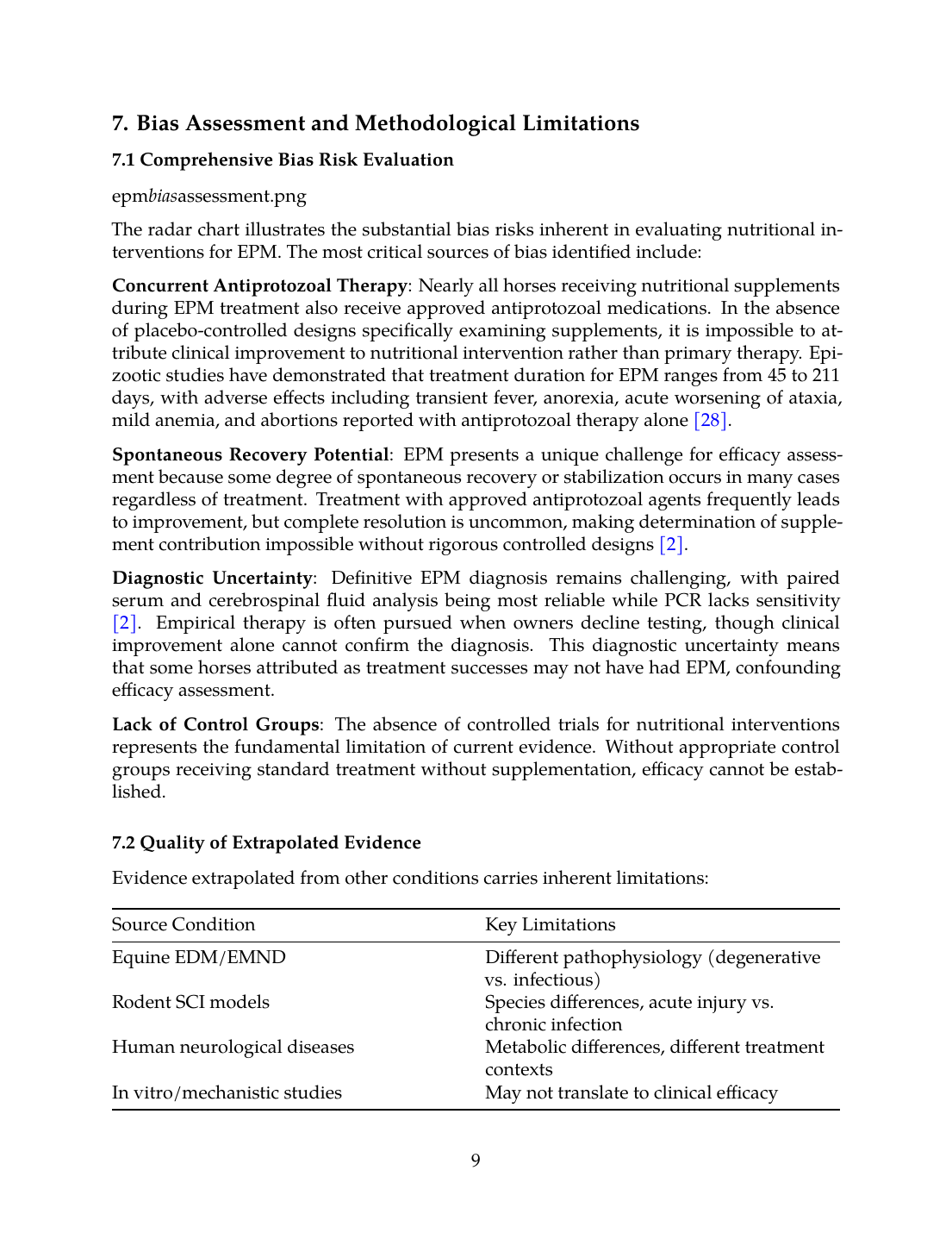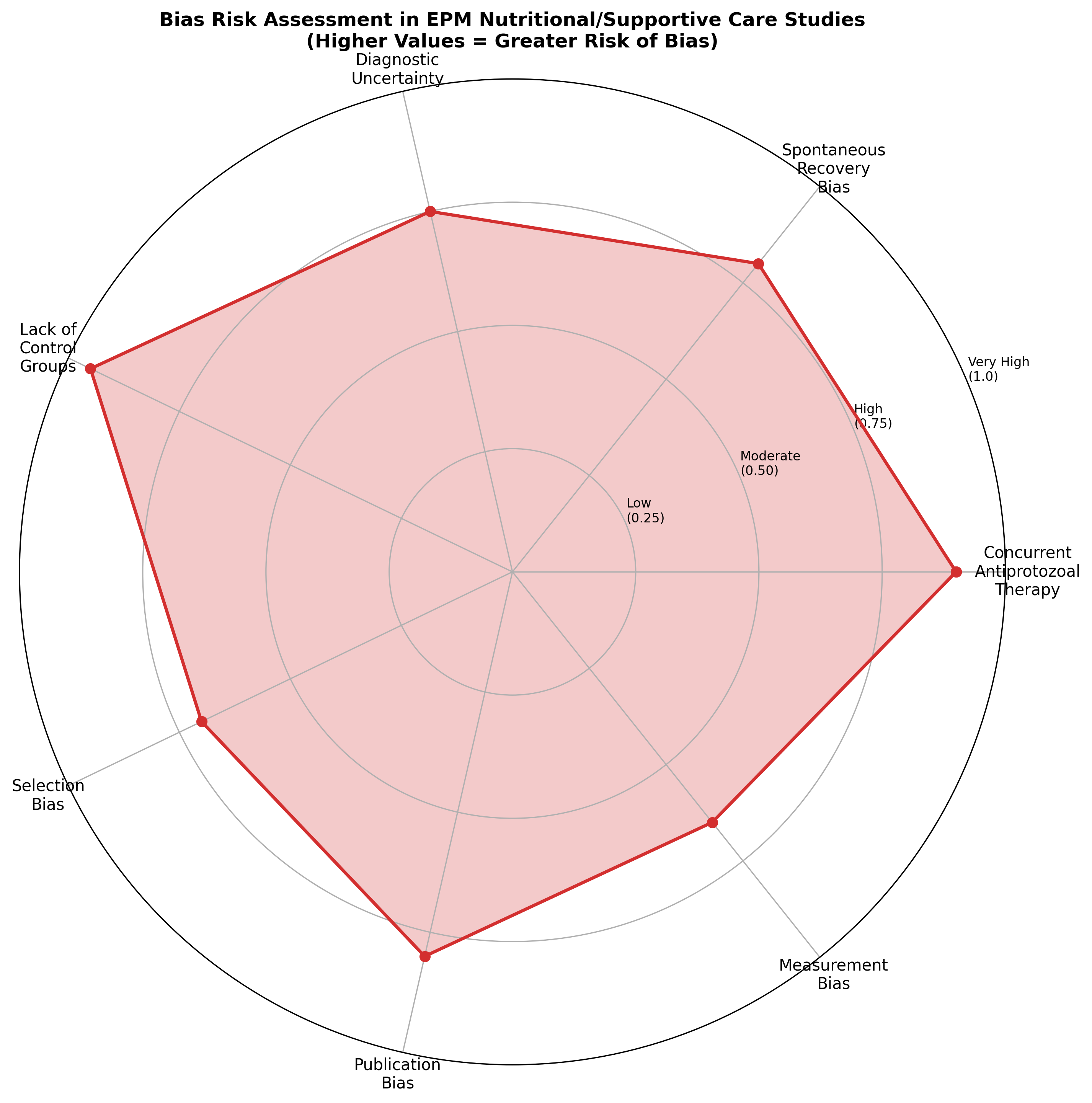 The radar chart illustrates the substantial bias risks inherent in evaluating nutritional interventions for EPM. The most critical sources of bias identified include: