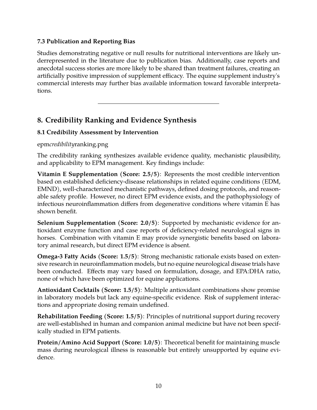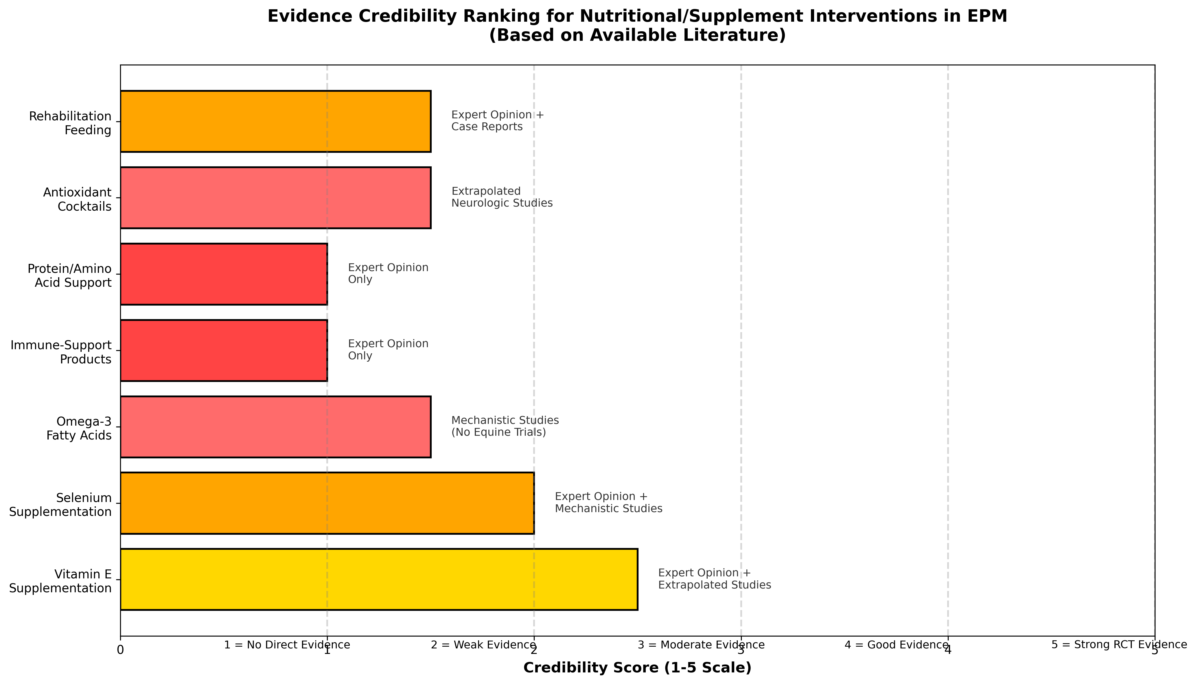 Vitamin E Supplementation (Score: 2.5/5): Represents the most credible intervention based on established deficiency-disease relationships in related equine conditions (EDM, EMND), well-characterized mechanistic pathways, defined dosing protocols, and reasonable safety profile. However, no direct EPM evidence exists, and the pathophysiology of infectious neuroinflammation differs from degenerative conditions where vitamin E has shown benefit.