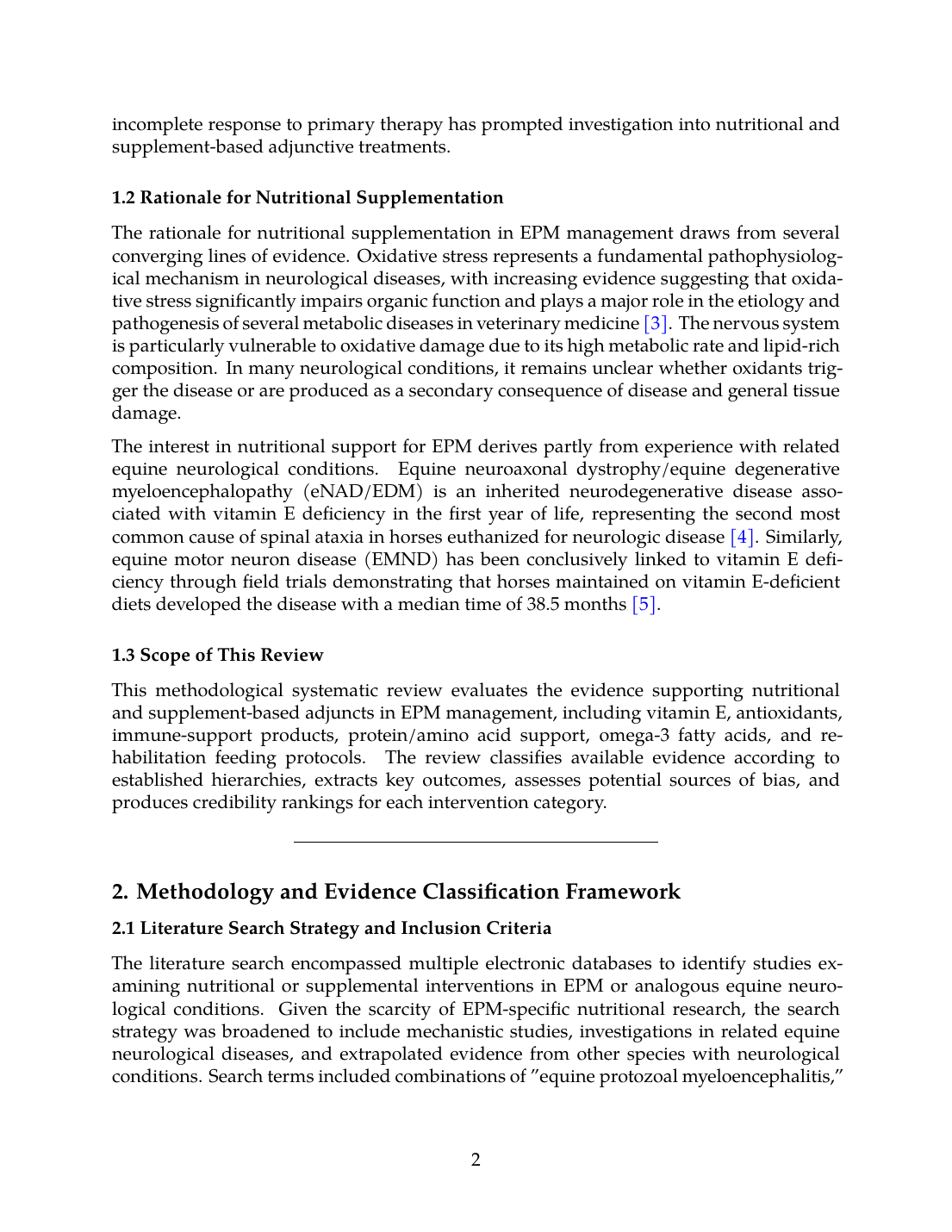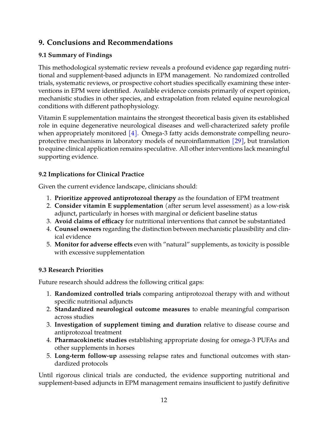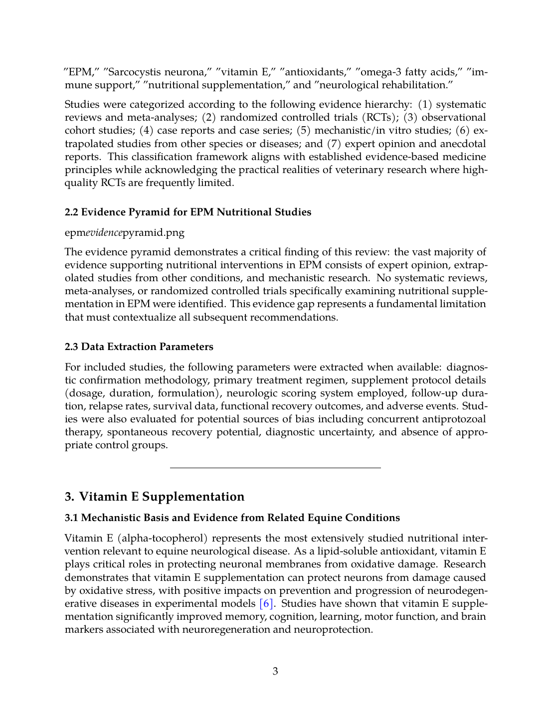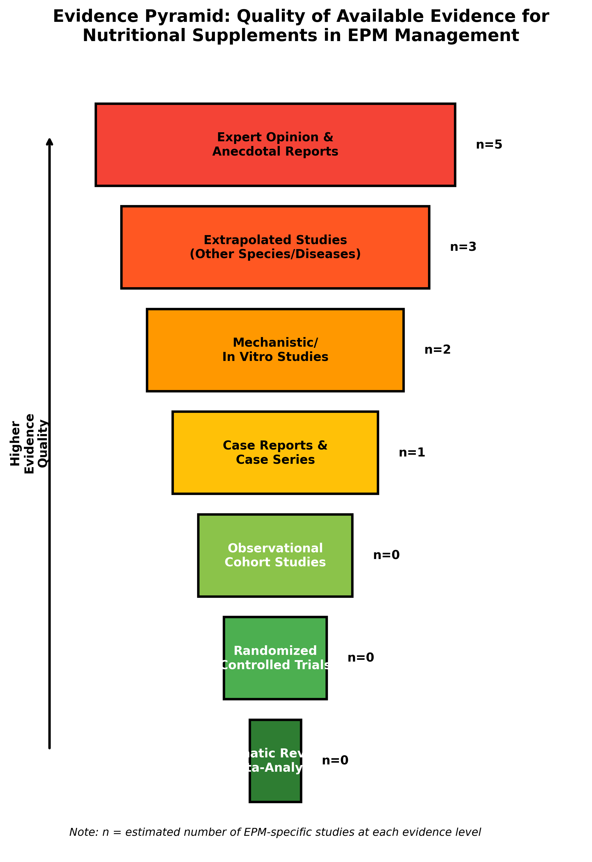 This methodological systematic review reveals a profound evidence gap regarding nutritional and supplement-based adjuncts in EPM management. No randomized controlled trials, systematic reviews, or prospective cohort studies specifically examining these interventions in EPM were identified. Available evidence consists primarily of expert opinion, mechanistic studies in other species, and extrapolation from related equine neurological conditions with different pathophysiology.