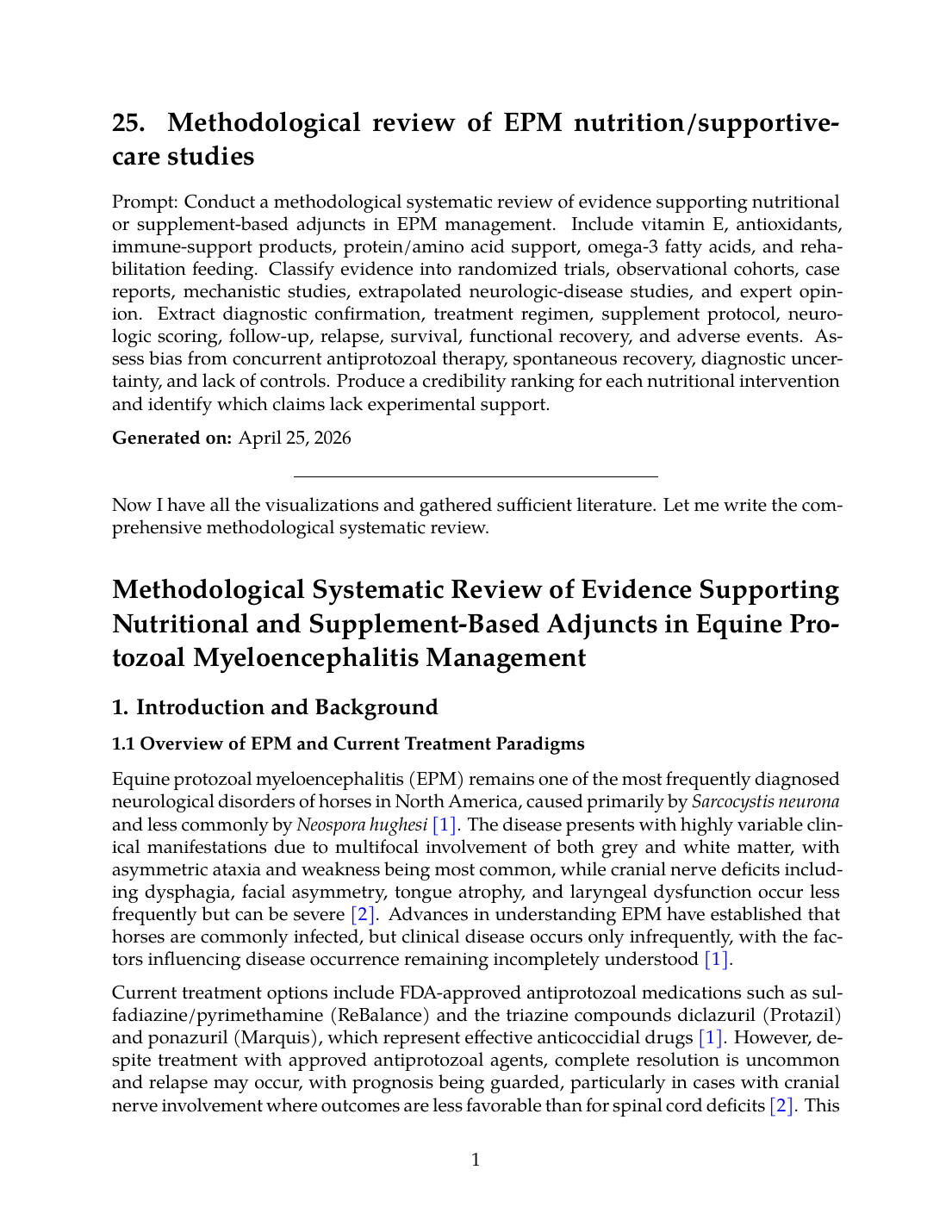This methodological systematic review evaluates the evidence supporting nutritional and supplement-based adjuncts in EPM management, including vitamin E, antioxidants, immune-support products, protein/amino acid support, omega-3 fatty acids, and rehabilitation feeding protocols. The review classifies available evidence according to established hierarchies, extracts key outcomes, assesses potential sources of bias, and produces credibility rankings for each intervention category.