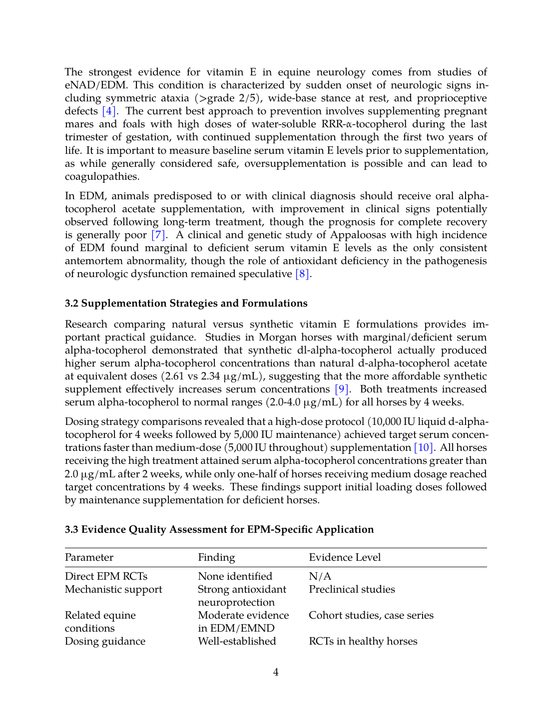 The strongest evidence for vitamin E in equine neurology comes from studies of eNAD/EDM. This condition is characterized by sudden onset of neurologic signs including symmetric ataxia (>grade 2/5), wide-base stance at rest, and proprioceptive defects [4]. The current best approach to prevention involves supplementing pregnant mares and foals with high doses of water-soluble RRR-α-tocopherol during the last trimester of gestation, with continued supplementation through the first two years of life. It is important to measure baseline serum vitamin E levels prior to supplementation, as while generally considered safe, oversupplementation is possible and can lead to coagulopathies.