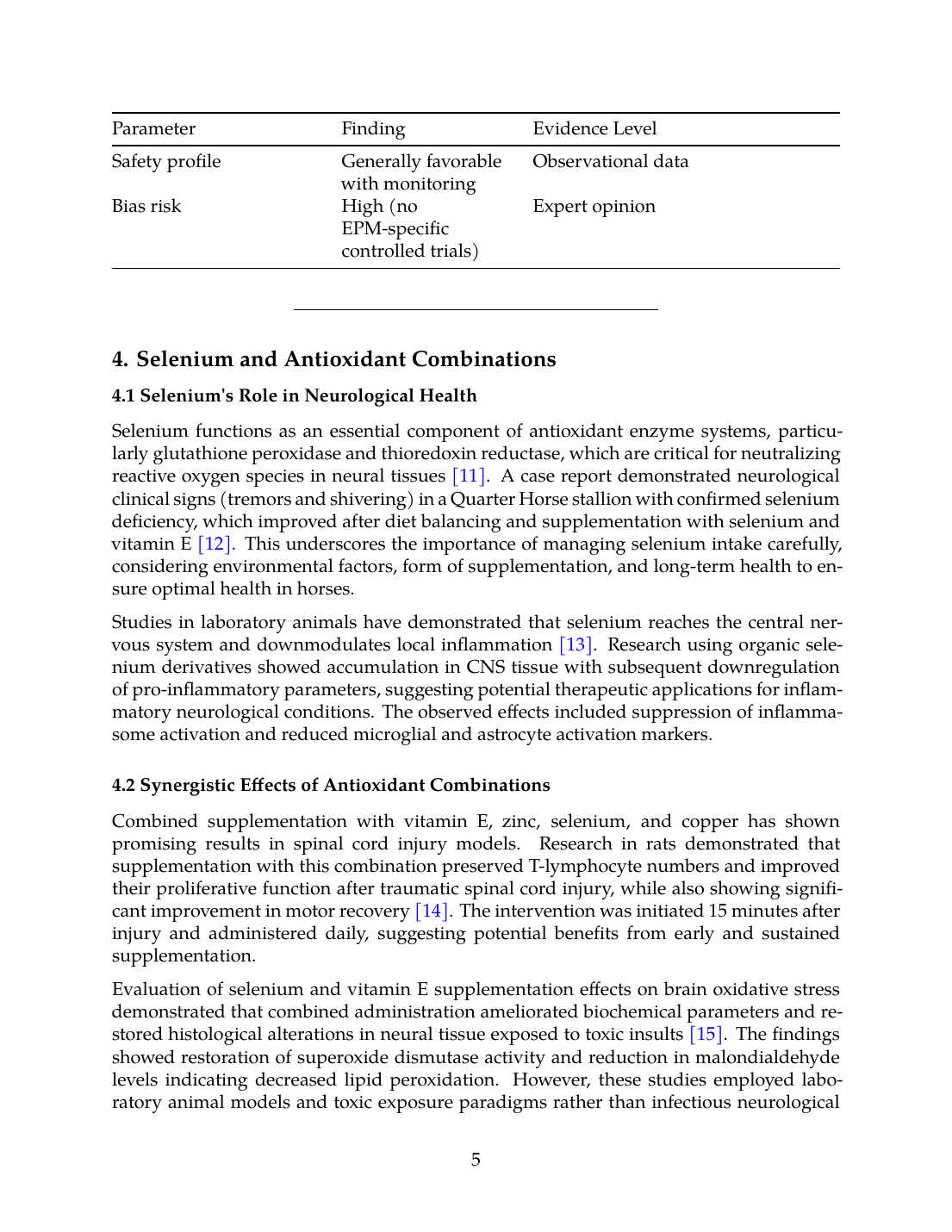Selenium Supplementation (Score: 2.0/5): Supported by mechanistic evidence for antioxidant enzyme function and case reports of deficiency-related neurological signs in horses. Combination with vitamin E may provide synergistic benefits based on laboratory animal research, but direct EPM evidence is absent.