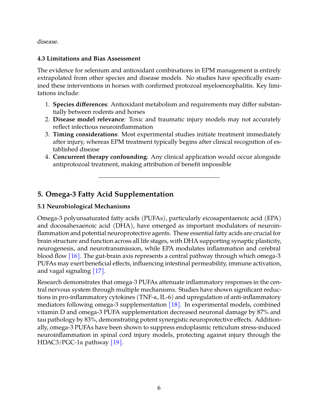 The evidence for selenium and antioxidant combinations in EPM management is entirely extrapolated from other species and disease models. No studies have specifically examined these interventions in horses with confirmed protozoal myeloencephalitis. Key limitations include: