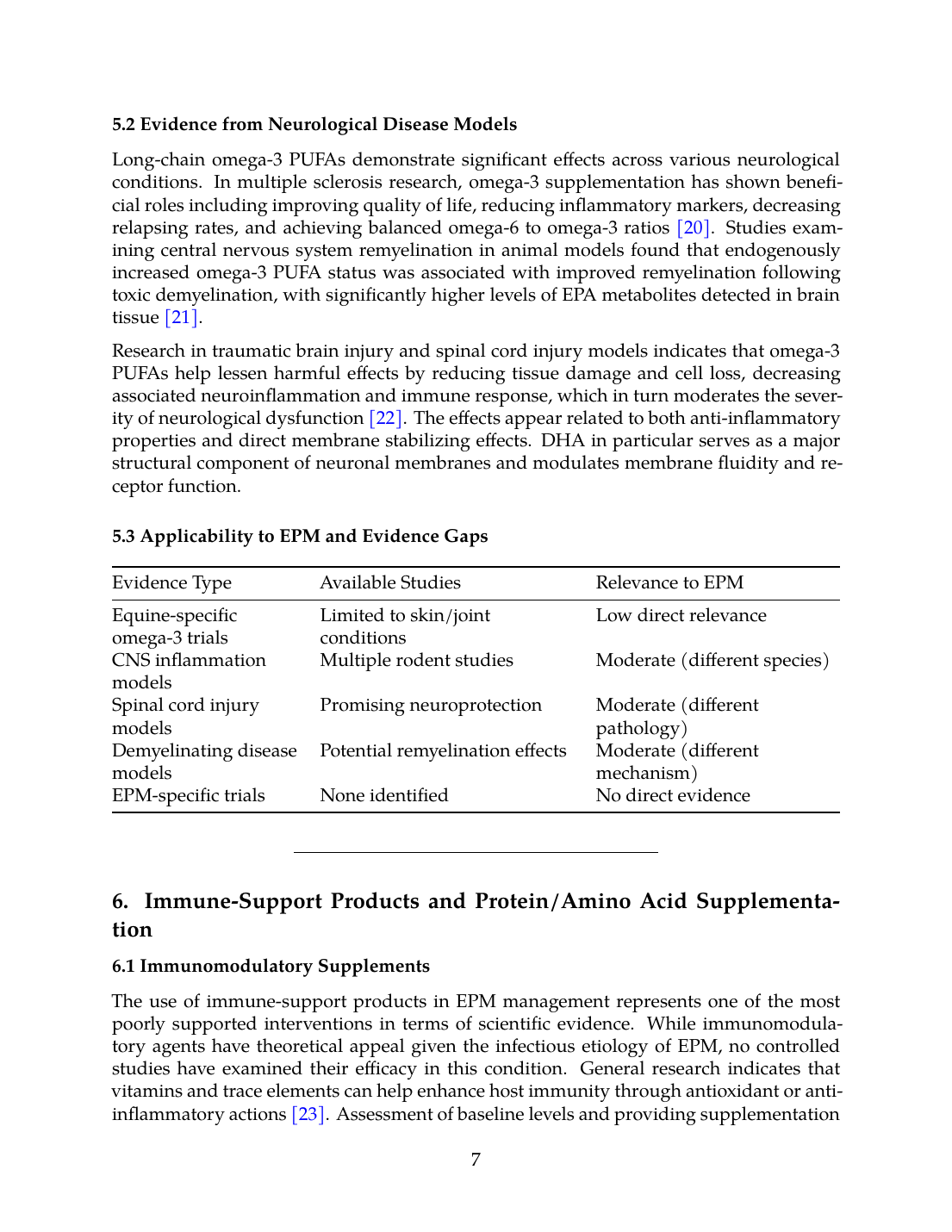 Omega-3 Fatty Acids (Score: 1.5/5): Strong mechanistic rationale exists based on extensive research in neuroinflammation models, but no equine neurological disease trials have been conducted. Effects may vary based on formulation, dosage, and EPA:DHA ratio, none of which have been optimized for equine applications.