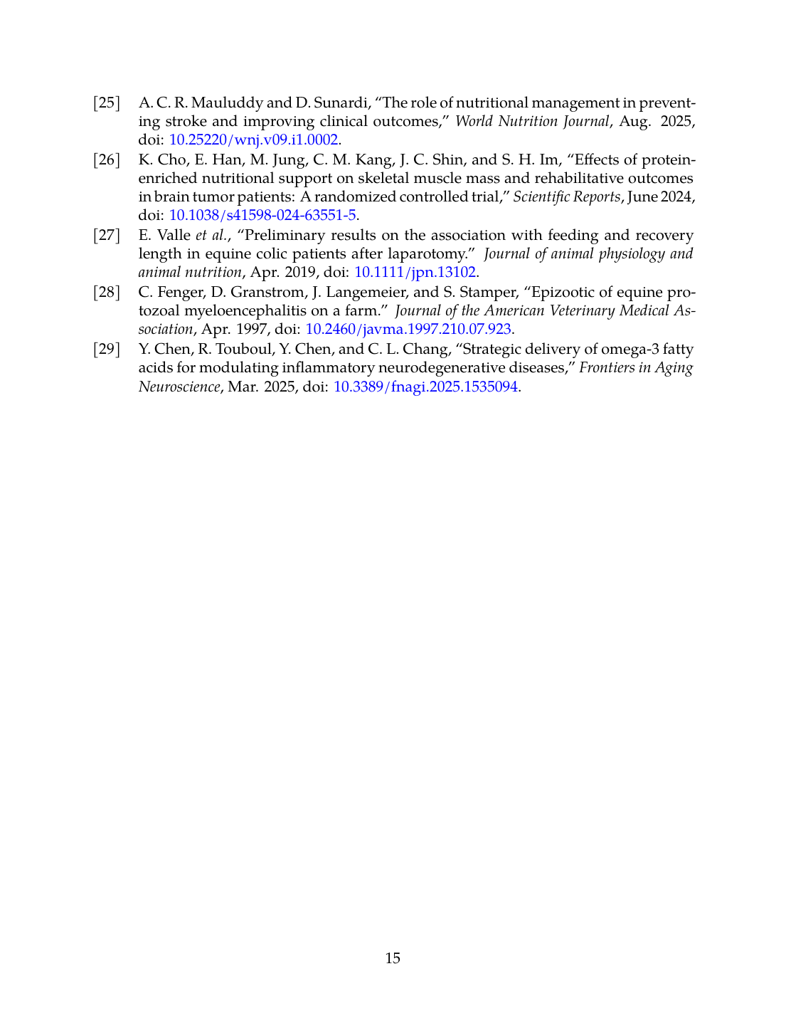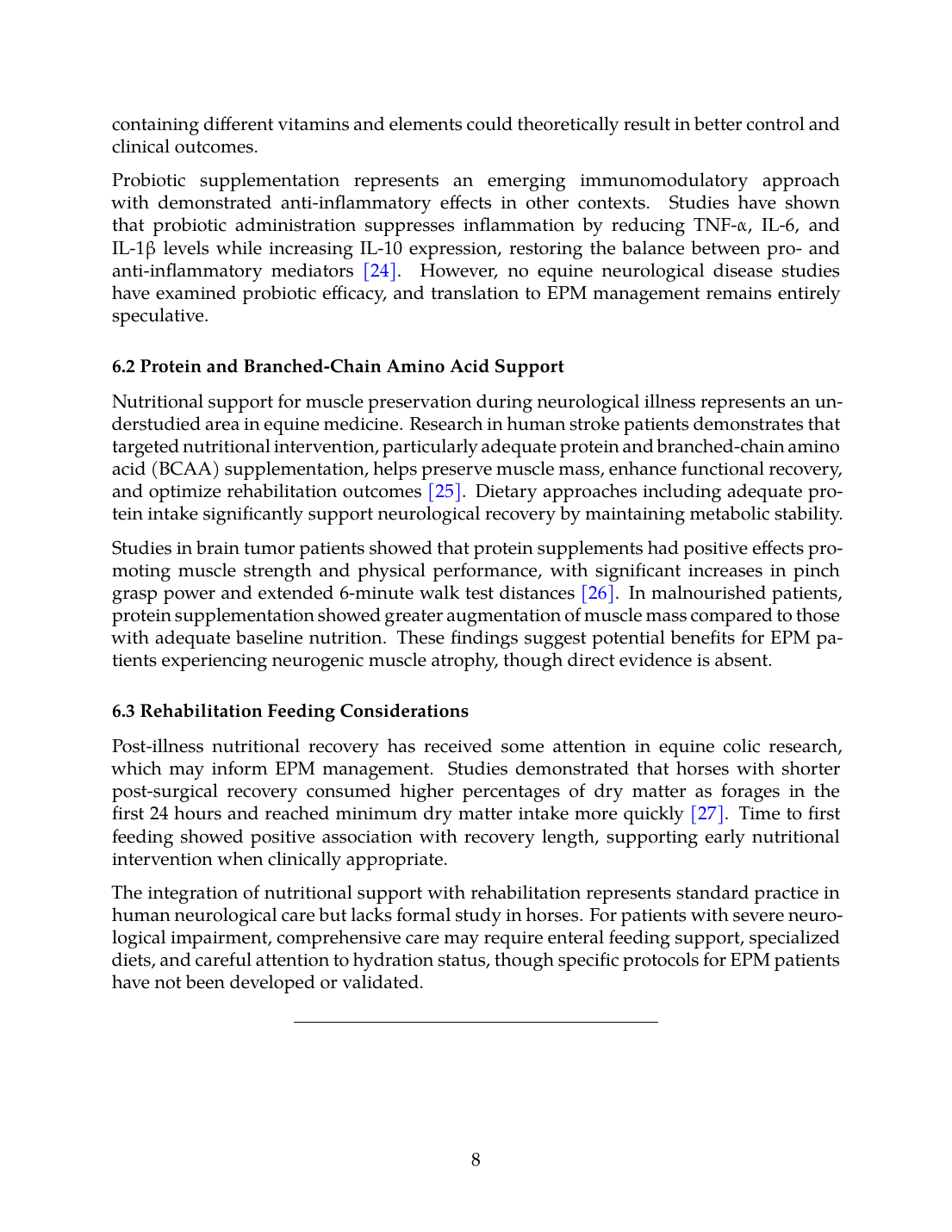 Rehabilitation Feeding (Score: 1.5/5): Principles of nutritional support during recovery are well-established in human and companion animal medicine but have not been specifically studied in EPM patients.