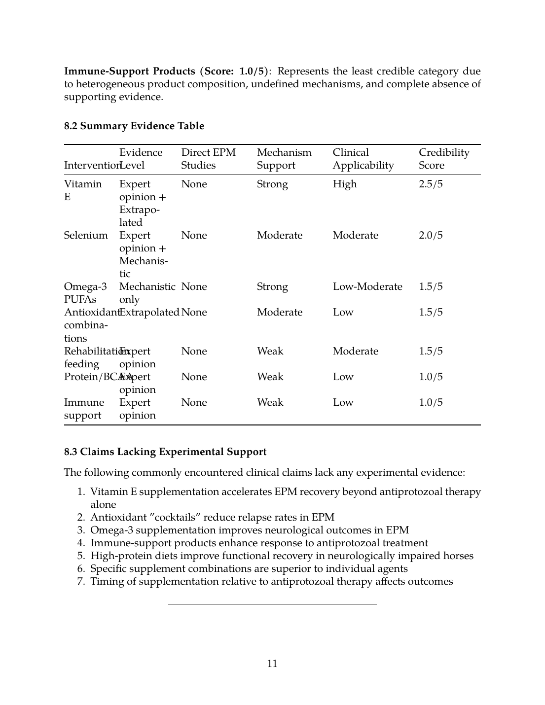 Until rigorous clinical trials are conducted, the evidence supporting nutritional and supplement-based adjuncts in EPM management remains insufficient to justify definitive recommendations. Practitioners and horse owners should maintain realistic expectations and recognize that currently available supplements represent unproven interventions regardless of marketing claims.