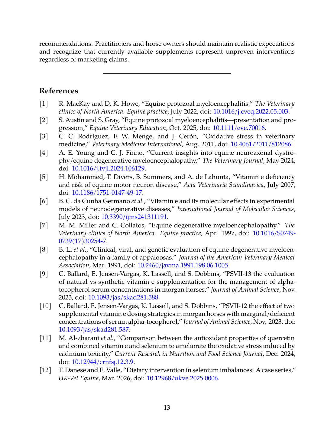 12. T. Danese and E. Valle, “Dietary intervention in selenium imbalances: a case series,” UK-Vet Equine, Mar. 2026. doi: 10.12968/ukve.2025.0006. View source