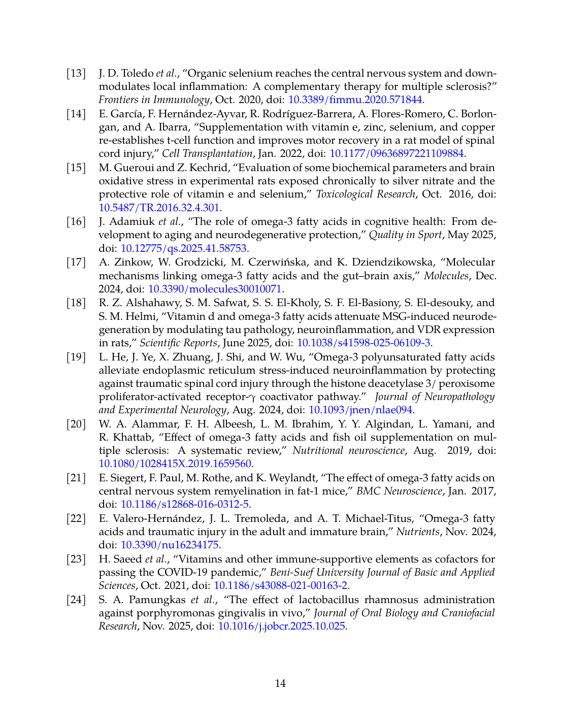 13. J. De Toledo, T. F. C. Fraga-Silva, P. Borim, L. R. C. D. Oliveira, E. D. S. Oliveira, L. L. Périco, C. Hiruma-Lima, A. A. D. de Souza, C. A. D. de Oliveira, P. Padilha, M. Pinatto-Botelho, A. D. dos Santos, A. Sartori, and S. Zorzella-Pezavento, “Organic Selenium Reaches the Central Nervous System and Downmodulates Local Inflammation: A Complementary Therapy for Multiple Sclerosis?,” Frontiers in Immunology, Oct. 2020. doi: 10.3389/fimmu.2020.571844. View source