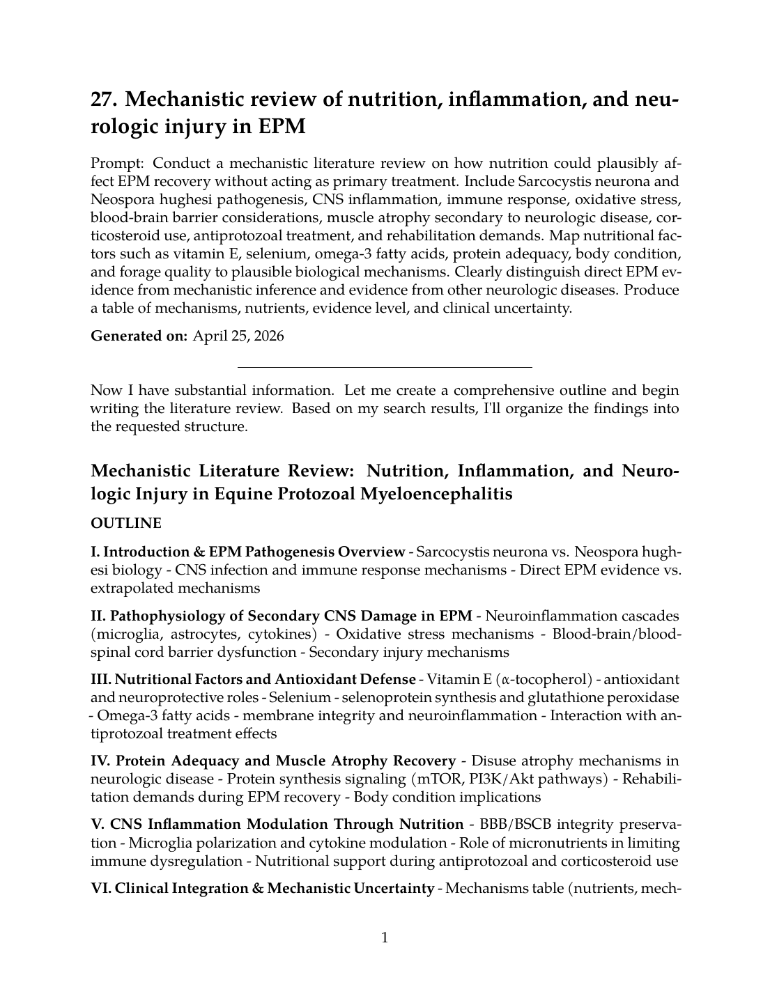 This comprehensive mechanistic review integrates current understanding of EPM pathogenesis, secondary CNS injury, and nutritional physiology to outline plausible—but largely unproven—nutritional interventions supporting EPM recovery. The distinction between direct EPM evidence, extrapolated SCI/neurologic disease mechanisms, and general biologic principles is maintained throughout, acknowledging substantial clinical uncertainty while providing a framework for evidence-informed practice pending rigorous equine-specific research.