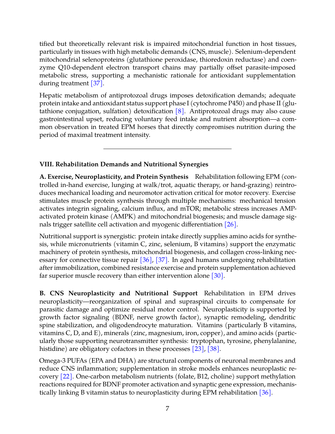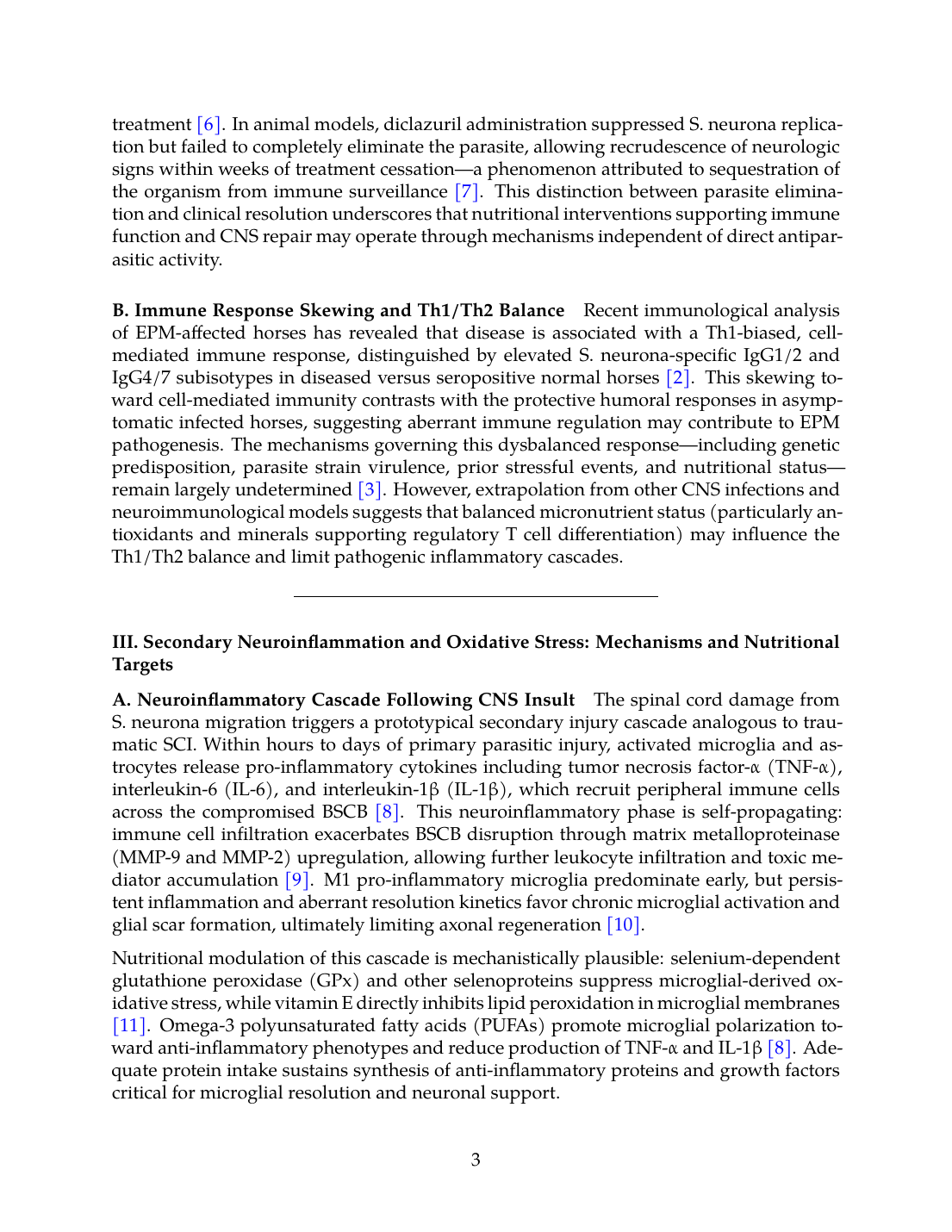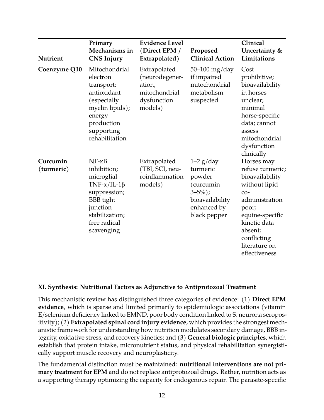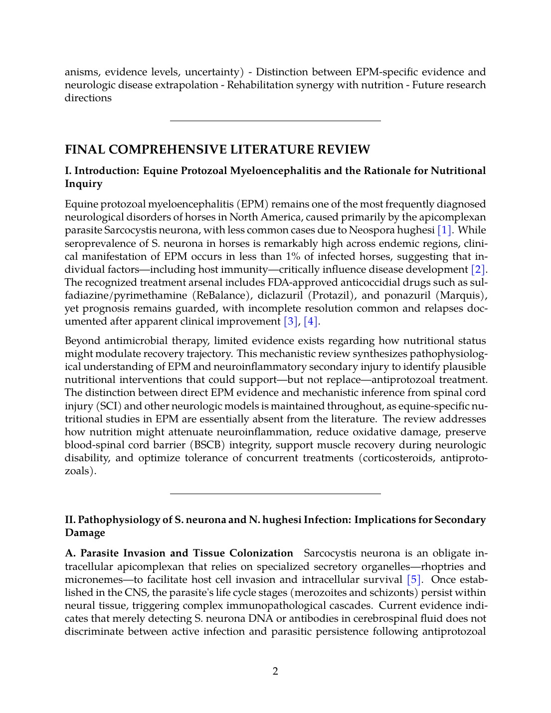 The fundamental distinction must be maintained: nutritional interventions are not primary treatment for EPM and do not replace antiprotozoal drugs. Rather, nutrition acts as a supporting therapy optimizing the capacity for endogenous repair. The parasite-specific damage caused by S. neurona or N. hughesi requires direct antimicrobial eradication; nutritional strategies cannot achieve this. However, once primary parasitic injury occurs, secondary inflammation, oxidative stress, BSCB disruption, and muscle catabolism become targets for nutritional modulation.