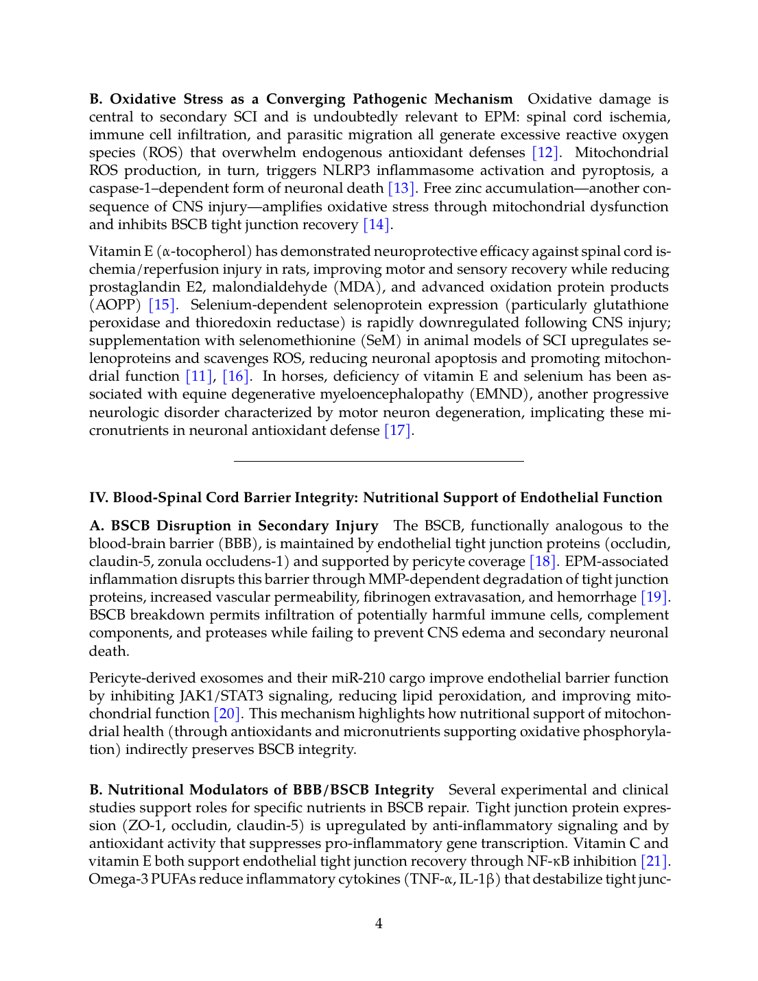 Oxidative damage is central to secondary SCI and is undoubtedly relevant to EPM: spinal cord ischemia, immune cell infiltration, and parasitic migration all generate excessive reactive oxygen species (ROS) that overwhelm endogenous antioxidant defenses [12]. Mitochondrial ROS production, in turn, triggers NLRP3 inflammasome activation and pyroptosis, a caspase-1–dependent form of neuronal death [13]. Free zinc accumulation—another consequence of CNS injury—amplifies oxidative stress through mitochondrial dysfunction and inhibits BSCB tight junction recovery [14].