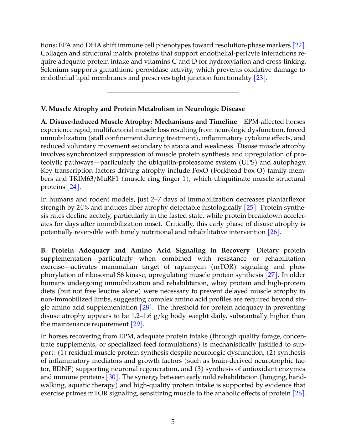 In horses recovering from EPM, adequate protein intake (through quality forage, concentrate supplements, or specialized feed formulations) is mechanistically justified to support: (1) residual muscle protein synthesis despite neurologic dysfunction, (2) synthesis of inflammatory mediators and growth factors (such as brain-derived neurotrophic factor, BDNF) supporting neuronal regeneration, and (3) synthesis of antioxidant enzymes and immune proteins [30]. The synergy between early mild rehabilitation (lunging, hand-walking, aquatic therapy) and high-quality protein intake is supported by evidence that exercise primes mTOR signaling, sensitizing muscle to the anabolic effects of protein [26].