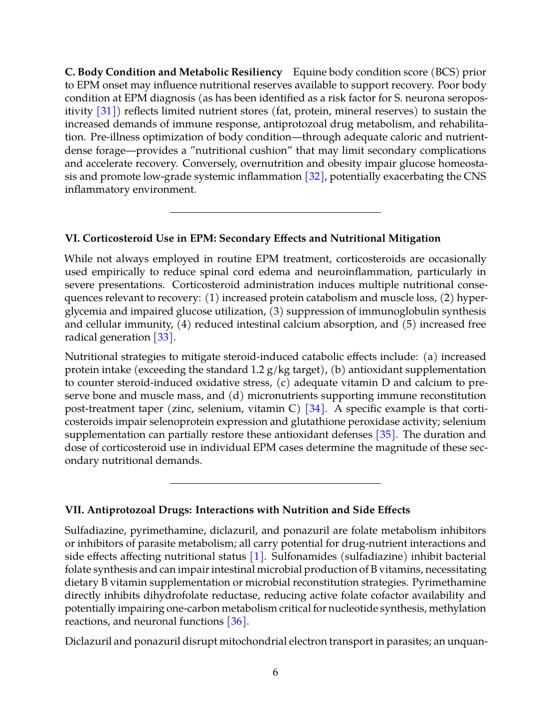 While not always employed in routine EPM treatment, corticosteroids are occasionally used empirically to reduce spinal cord edema and neuroinflammation, particularly in severe presentations. Corticosteroid administration induces multiple nutritional consequences relevant to recovery: (1) increased protein catabolism and muscle loss, (2) hyperglycemia and impaired glucose utilization, (3) suppression of immunoglobulin synthesis and cellular immunity, (4) reduced intestinal calcium absorption, and (5) increased free radical generation [33].