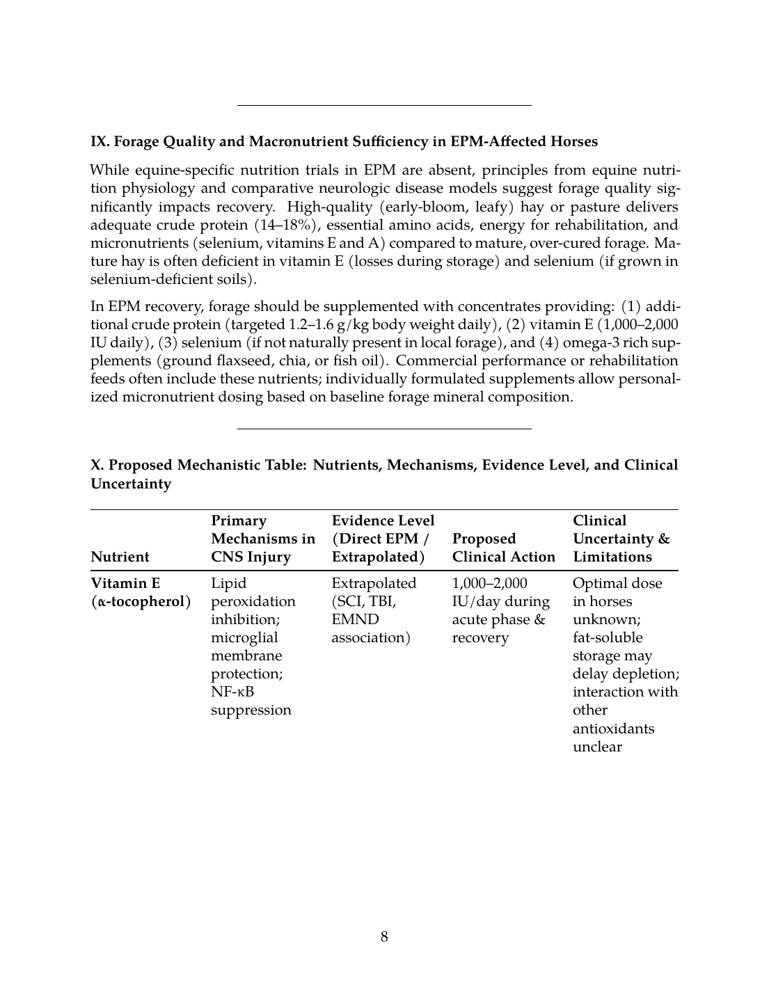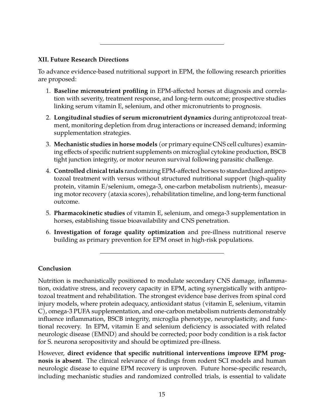 However, direct evidence that specific nutritional interventions improve EPM prognosis is absent. The clinical relevance of findings from rodent SCI models and human neurologic disease to equine EPM recovery is unproven. Future horse-specific research, including mechanistic studies and randomized controlled trials, is essential to validate nutritional approaches and refine clinical recommendations. Until such evidence is generated, nutritional support in EPM should be viewed as a reasonable, low-risk adjunct to antiprotozoal treatment, informed by general principles of neurologic disease recovery and tailored to individual forage composition, baseline micronutrient status, and rehabilitation demands—but never as a replacement for antimicrobial therapy or owner-led rehabilitative exercise.