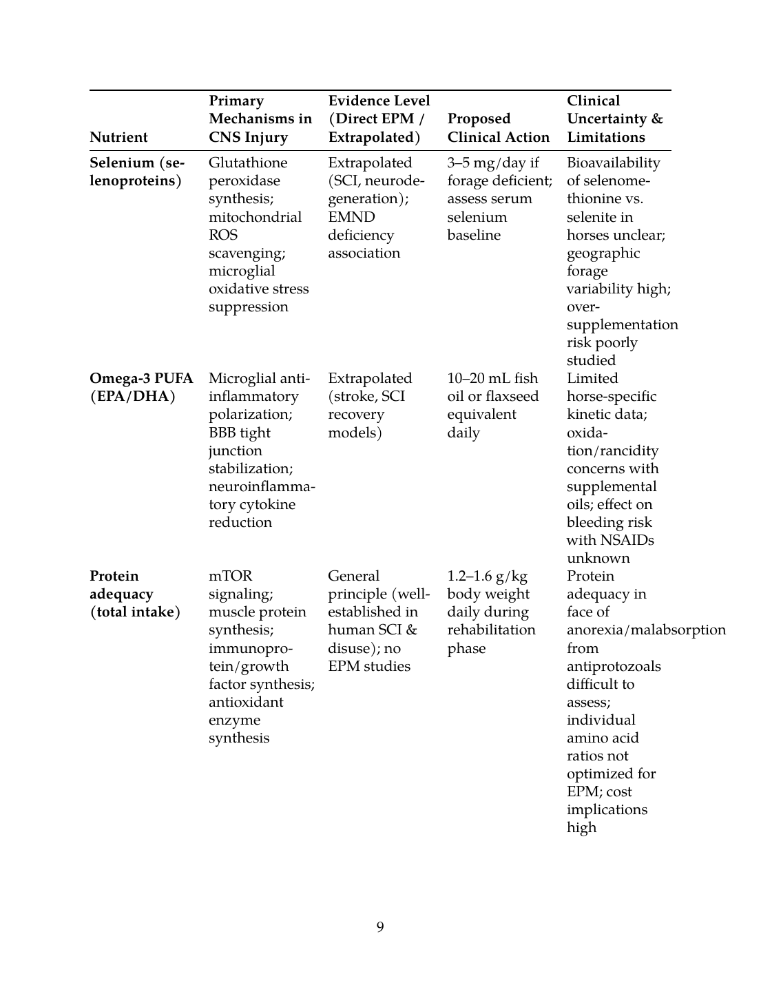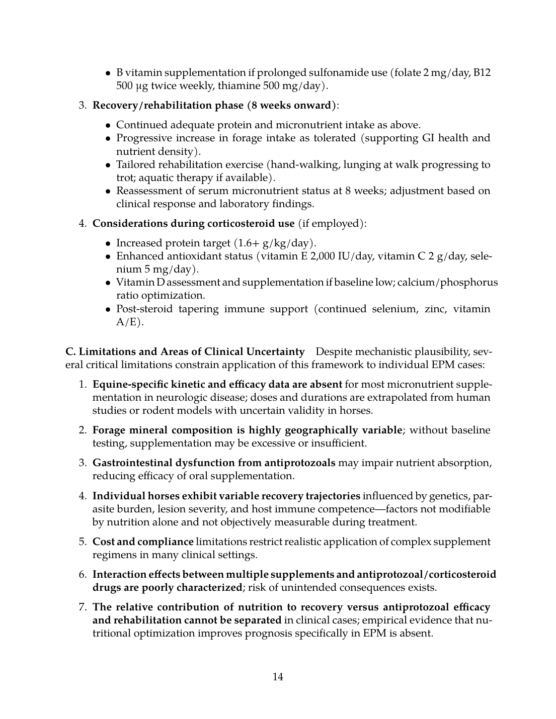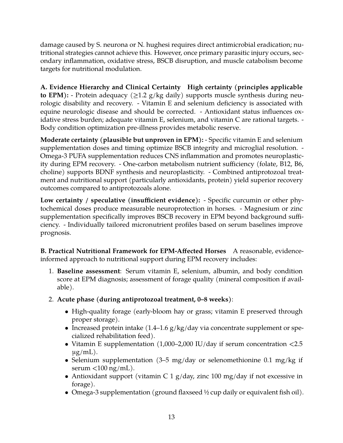 This mechanistic review has distinguished three categories of evidence: (1) Direct EPM evidence, which is sparse and limited primarily to epidemiologic associations (vitamin E/selenium deficiency linked to EMND, poor body condition linked to S. neurona seropositivity); (2) Extrapolated spinal cord injury evidence, which provides the strongest mechanistic framework for understanding how nutrition modulates secondary damage, BBB integrity, oxidative stress, and recovery kinetics; and (3) General biologic principles, which establish that protein intake, micronutrient status, and physical rehabilitation synergistically support muscle recovery and neuroplasticity.